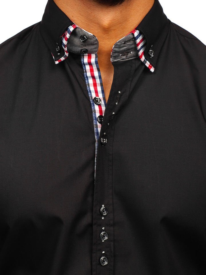 Cămașă neagră elegantă pentru bărbați 0926. Produsul are guler tip button down, nasturi, manșete reglabile, terminație rotunjită. Manșetele cămășiiau model în carouri bleumarin-roșu. Acest model este de asemenea la nasturi și guler. cămașaeste un model tip slim fit care se așează excelent pe corp. Modelul este o alternativă pentru cămășile clasice.