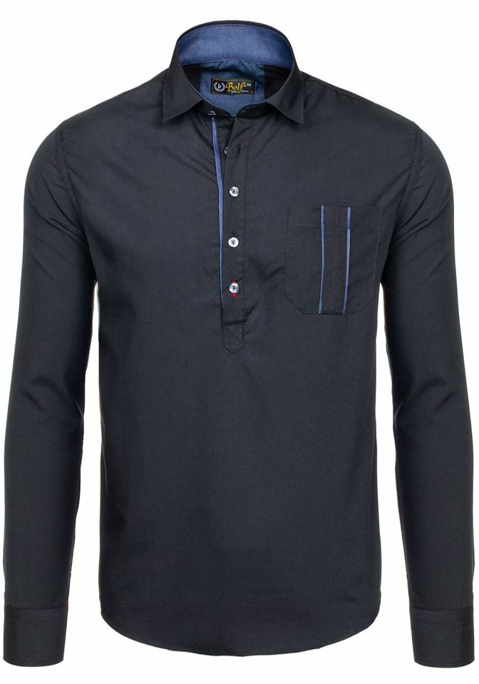 Cămăși negre, originale cu mâneca lungă Bolf pentru stilul relaxat. Comode, ușoare, cu guler frumos și terminația rotunjită. Cămașă neagră pentru bărbat slim fit are buzunar practic și stilat cu țesătură fumoasă. Este ideală pentru jeanși. Poart-o cu cardigan sau sacou.