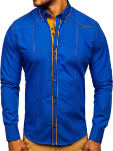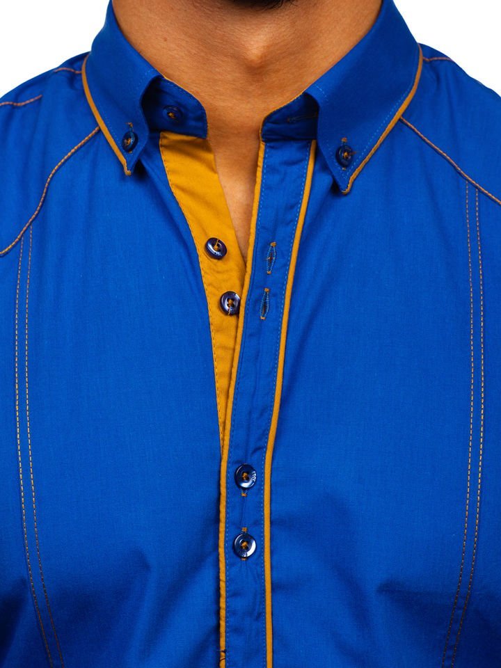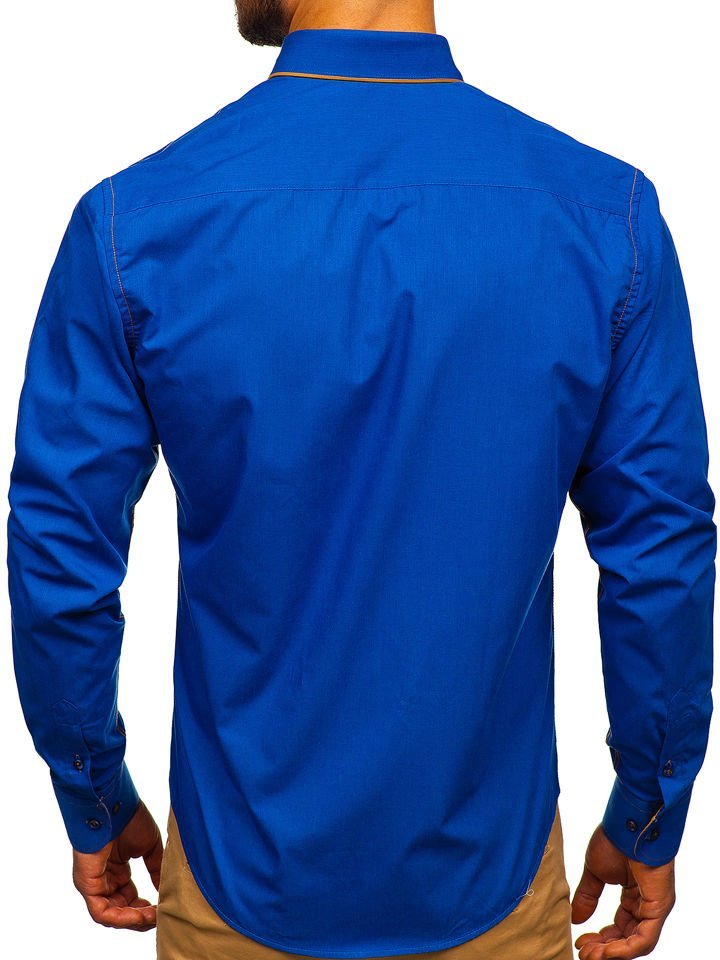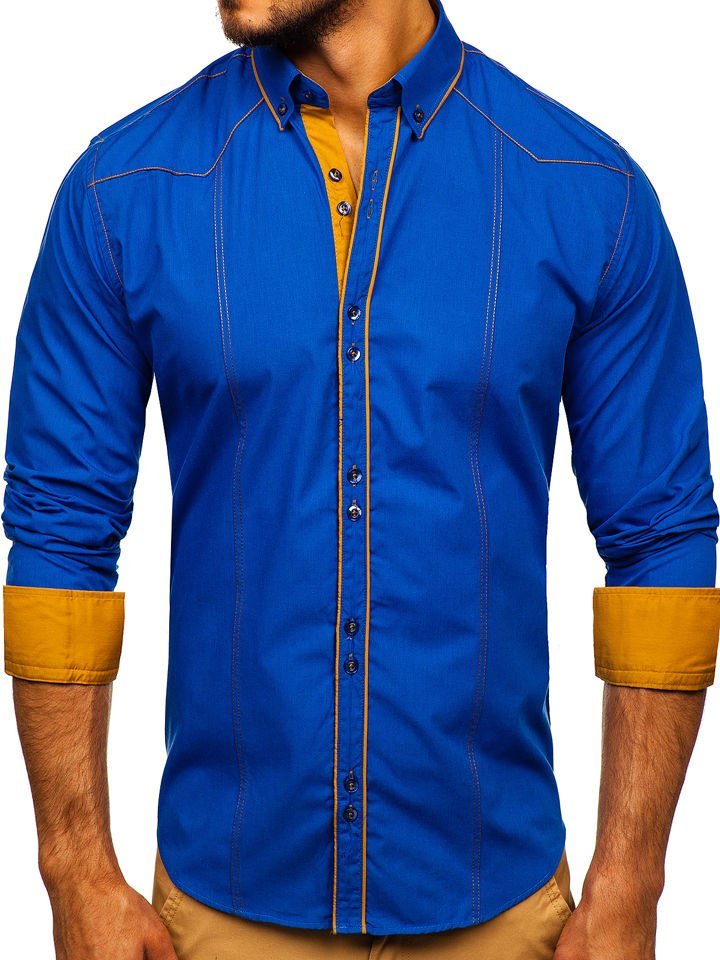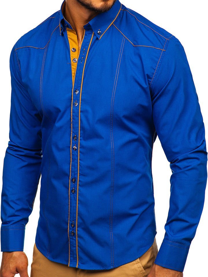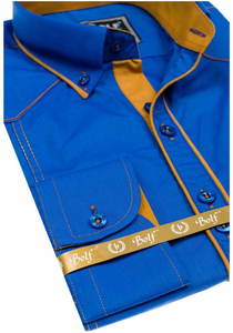 Cămăși albastre stilate cu mâneca lungă Bolf. Broderia îi adaugă stil, adăugător evidențiind silueta. Cămașa albastră pentru bărbat slim fit optic subțiază, are guler mai puțin formal button down. Cel mai bine arată combinată cu pantaloni chino și sacou sau cu jeanși.