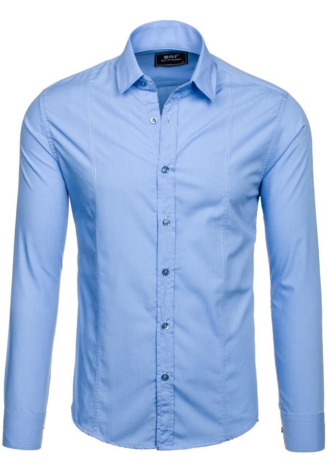 Cămăși bărbătești slim fit, de culoare albastru deschis, solide, Bolf, cu guler clasic Kent. Ideale cu cravată, sacou și în stilizările mai libere. Cămașa albastră-deschis cu mâneca lungă are culoare neutră, subțiază fain și accentueză umerii. Nu poate lipsi din dulapul bărbatului