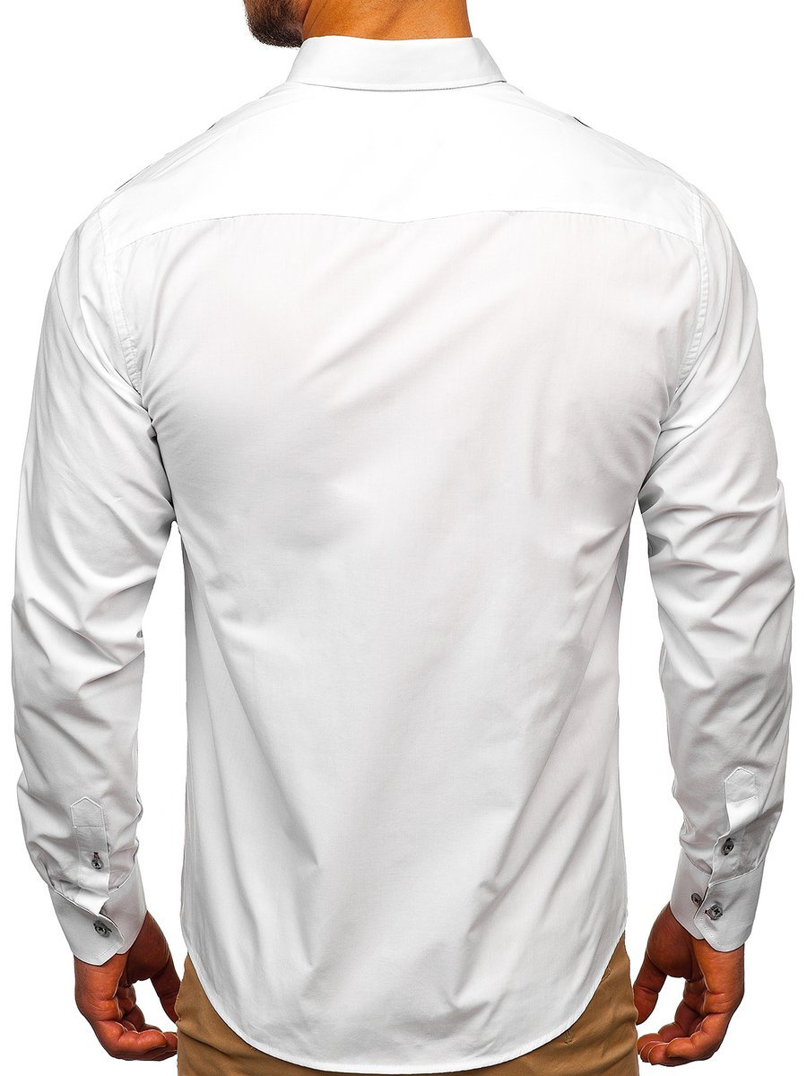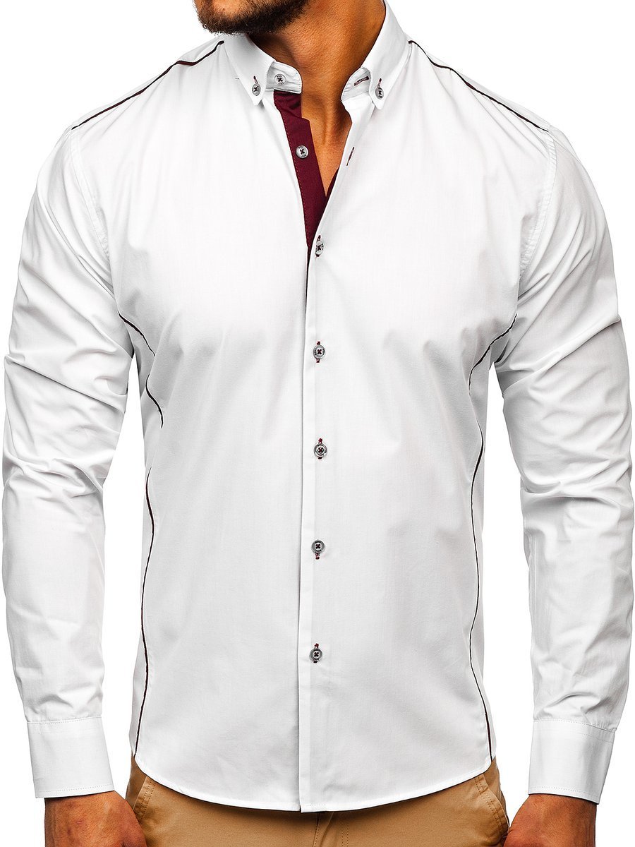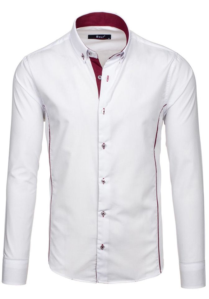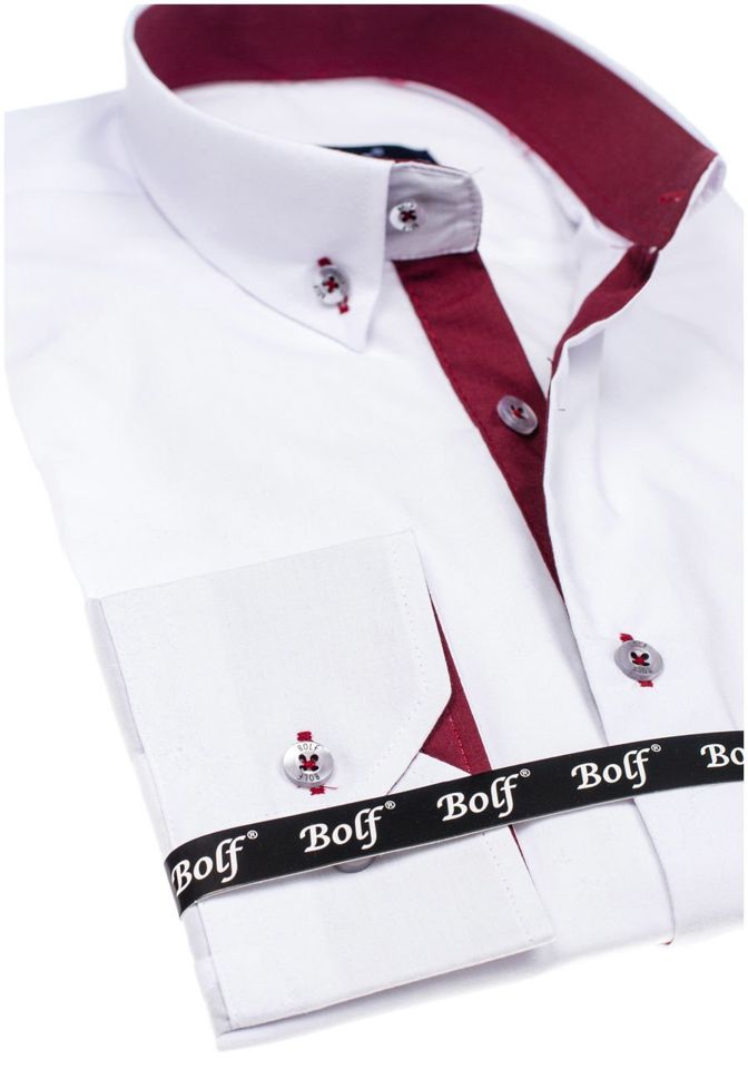 Cămăși stilate pentru bărbat bordo-albe de la Bolf. Croiala slim fit subțiază silueta, inserțiile bordo o evidențiază suplimentar. Cămașa albă-bordo pentru bărbat are guler frumos button down. Arată excelent în diverse stilizări. Cu sacou, jeanși, geacă de piele.