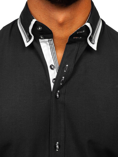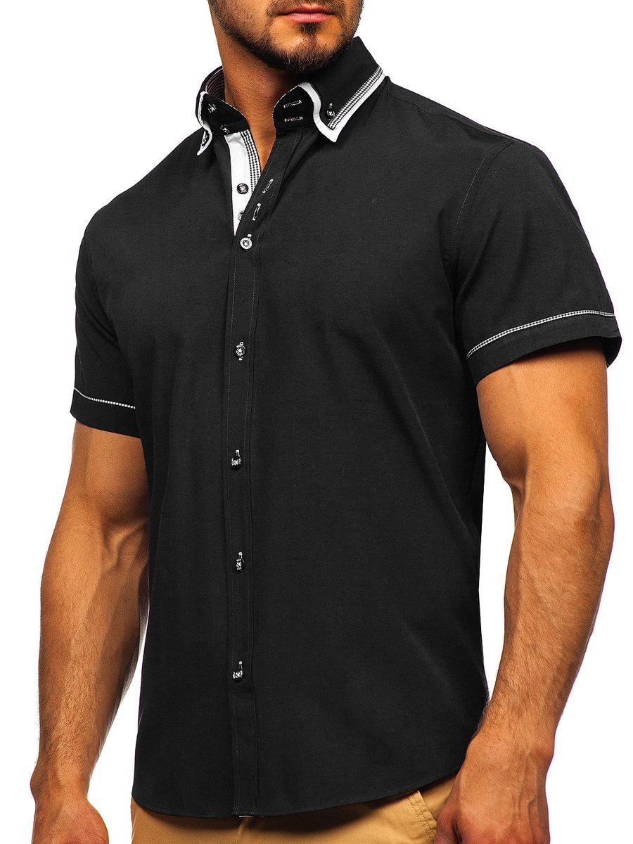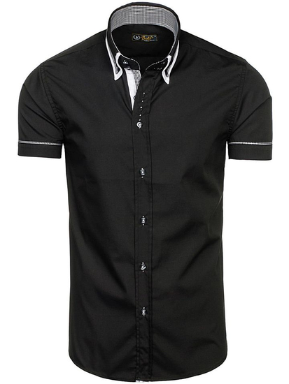 Cămăși negre cu mâneca scurtă, subțiază silueta de la Bolf. Expresive, stilate, minunat în outfit-urile informale. Cămașa neagră pentru bărbat slim fit, are închidere frumoasă și guler stilat dublu button down cu inserție în carouri. Foarte comod de purtat.