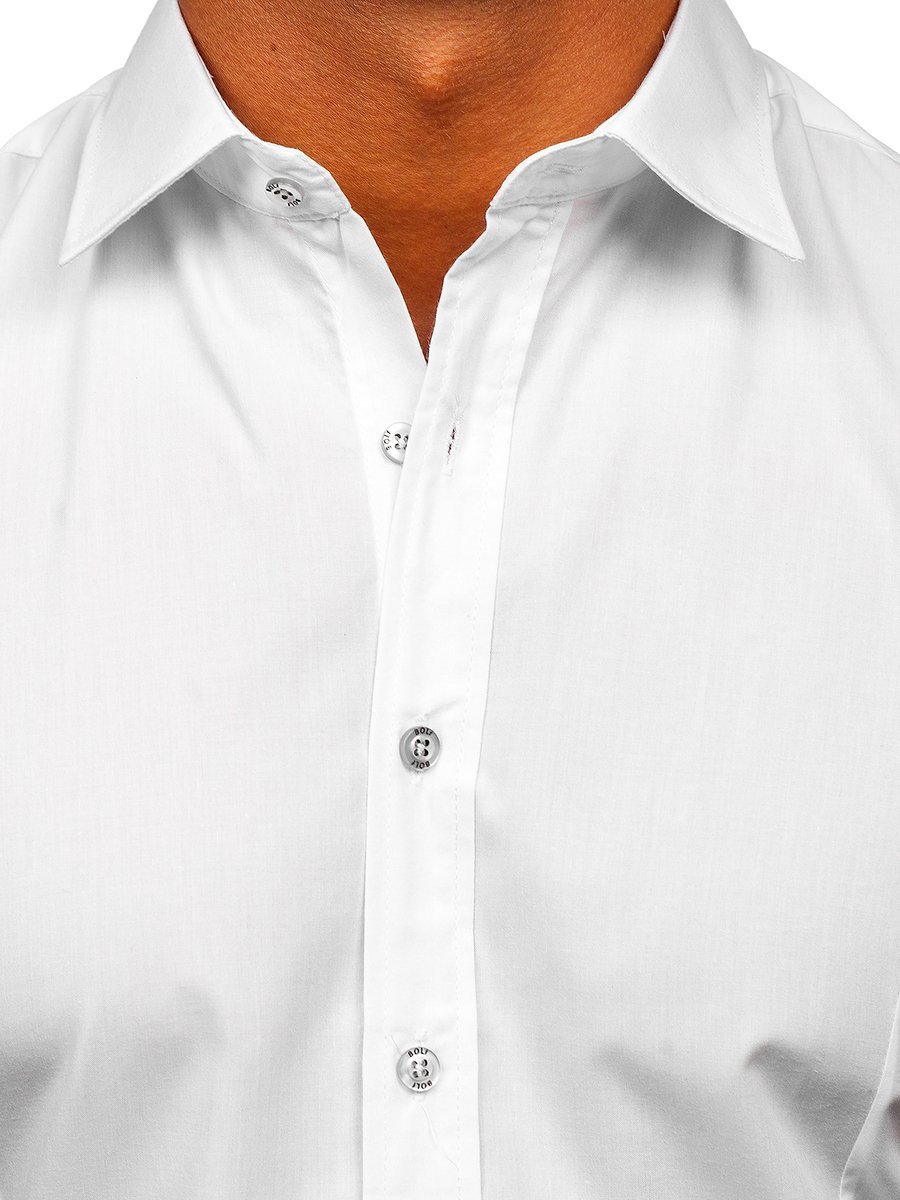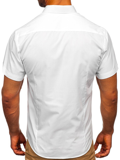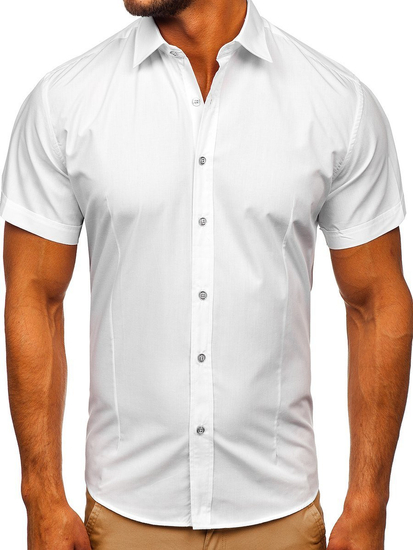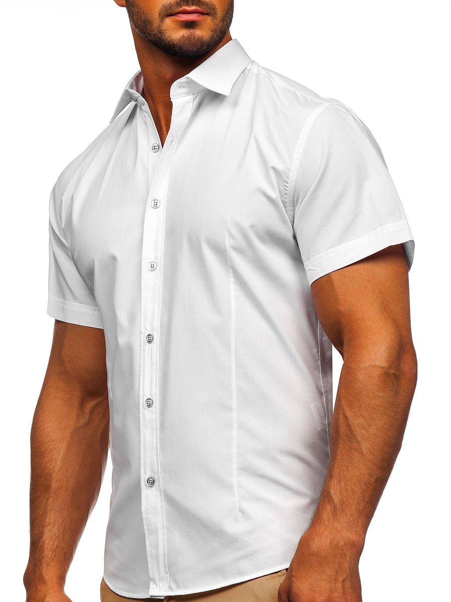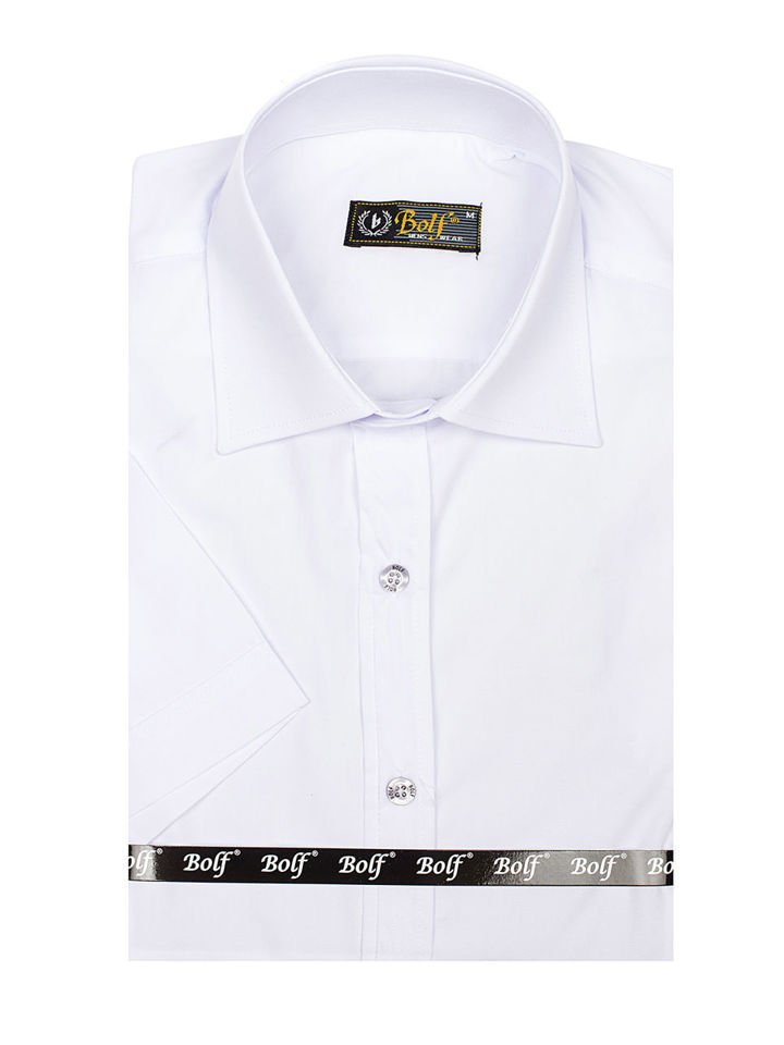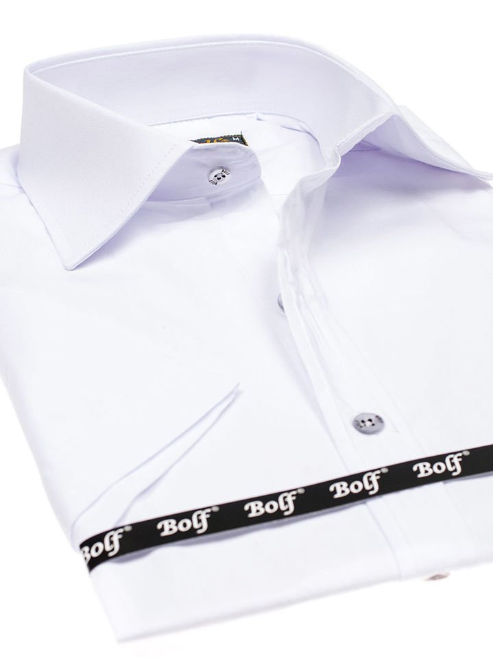 Cămași albe cu mâneca scurtă, calitate excelentă de la Bolf. Se așează excelent, comod de purtat, au guler frumos kent. Cămașa albă bărbați slim fit se potriveșțe ideal în ținute pentru zilele calde. Îmbrac-o cu jeanși, șorți, pantaloni chino, combină cu cardigan.