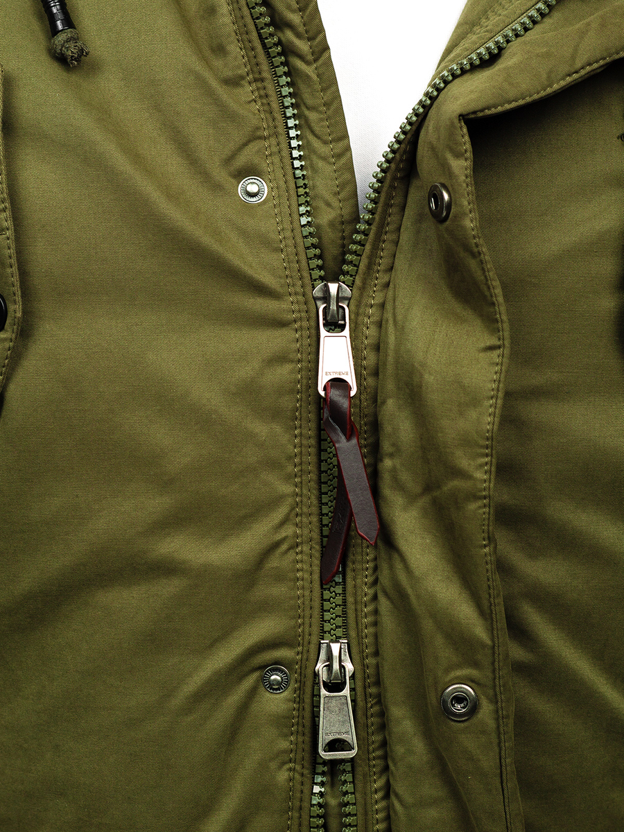 - Glugă integrată, călduroasă, reglabilă cu șnur, închiderea cu fermoar și nasture metalic