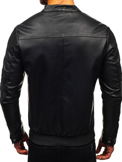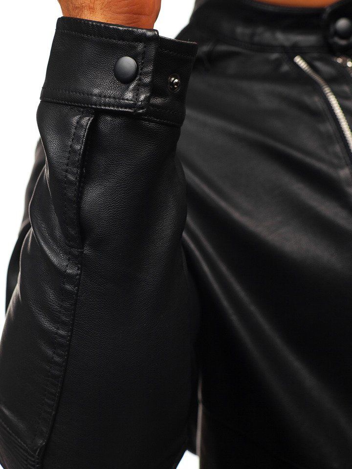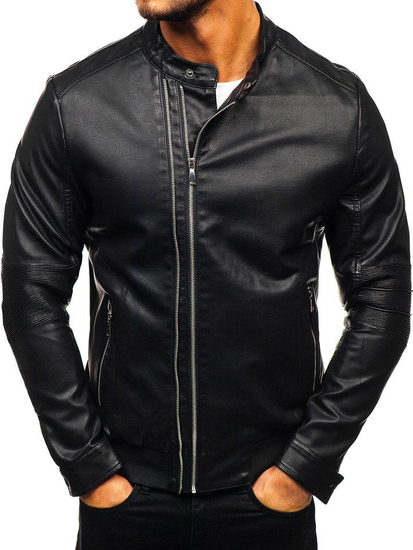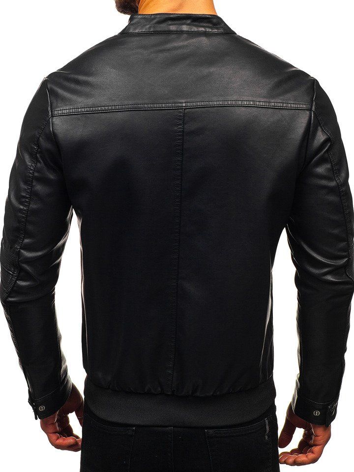 Geaca de piele neagră Bolf 1073 va fi un model excelent toamna și în zilele de primăvară. Geaca are închidere cu fermoar, ambele fermoare sunt funcționale. Țesături stilate la spate, pe laterală și mâneci. Are guler tip tunică cu închidere la nasturi. Două buzunare exterioare cu fermoar și unul interior. Mânecile reglabile cu nasturi iar la terminație cu elastic.