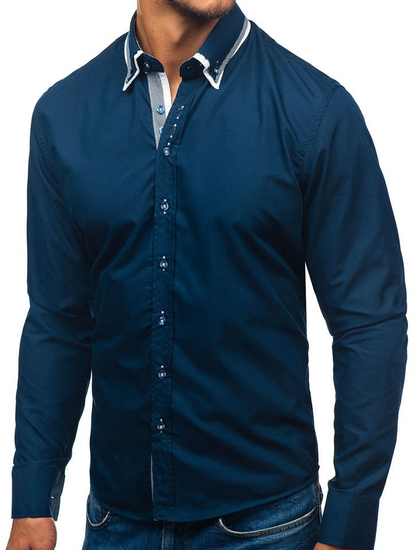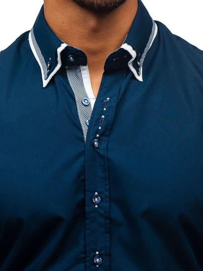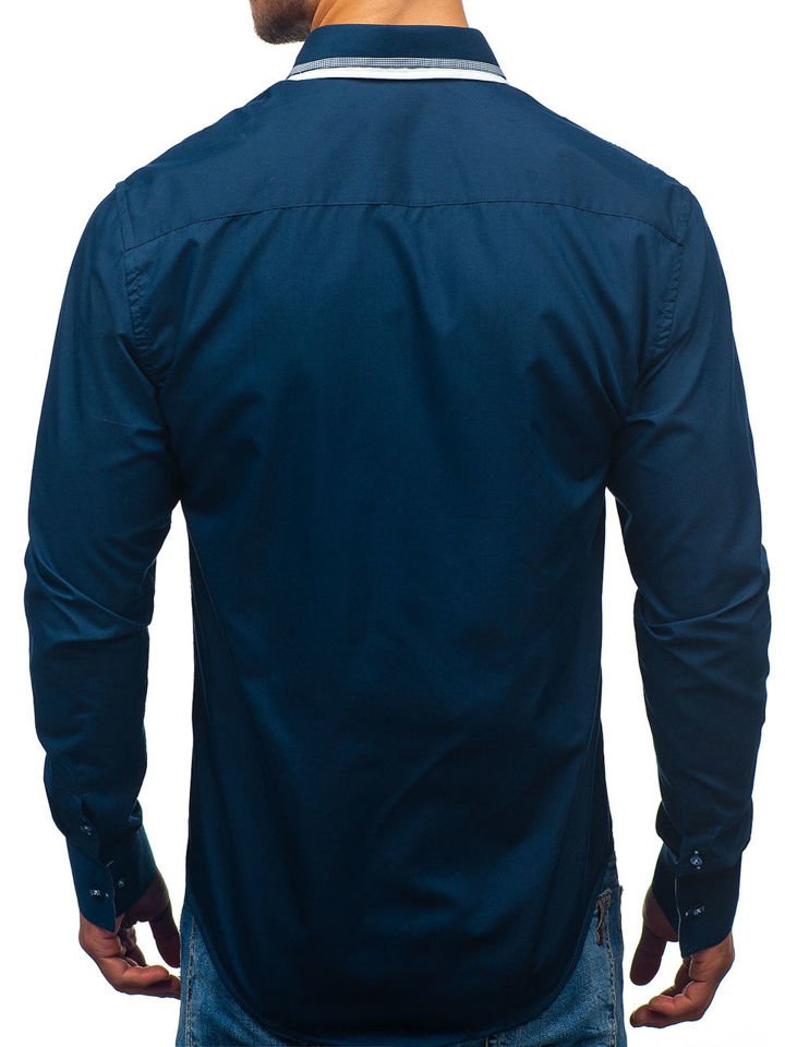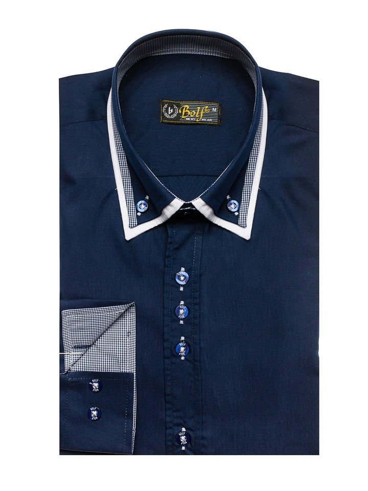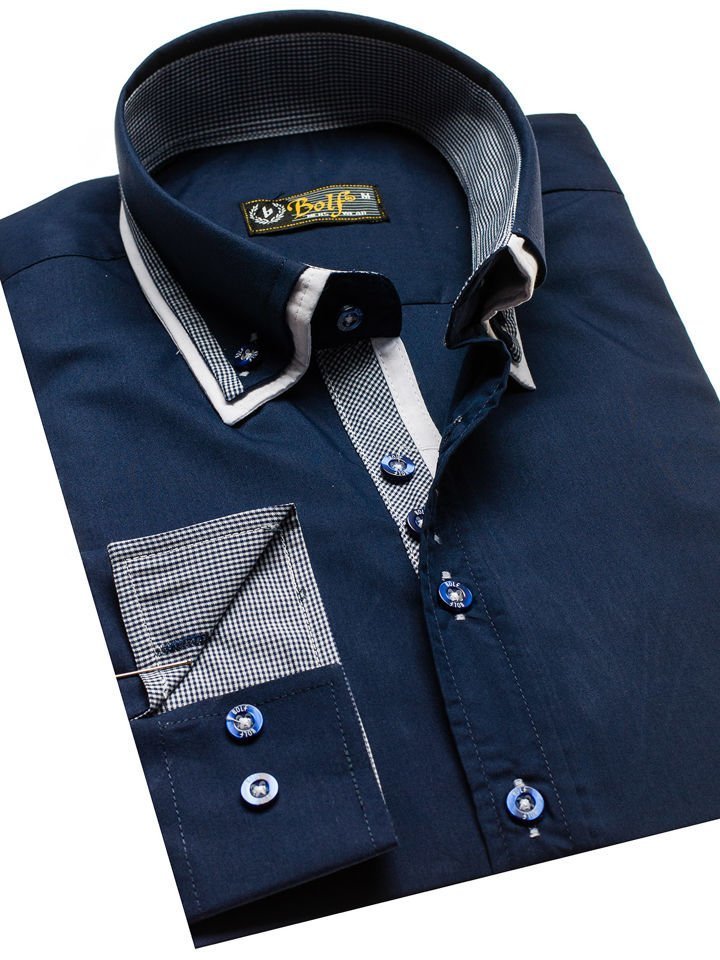 Cămăși stilate pentru bărbat slim fit Bolf cu guler dublu buttown down. De culoare bluemarin, terminația rotunjită și guler dublu cu inserție frumoasă. Cămașa pentru bărbat bluemarin este excelentă, genial se combină în outfit-urile cu sacou, pantaloni chino și geacă de piele. Este ideală zilnic și la ocazii speciale.