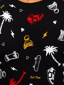 Tricouri bărbați negre din bumbacBolf. Sunt imprimate în model mărunt cu motiv de skateboard, palmieri, șepci și încălțăminte sportivă . T-shirtul negru cu imprimeu se potrivește ideal în ținutele zilnice cu jeanși sau joggers.