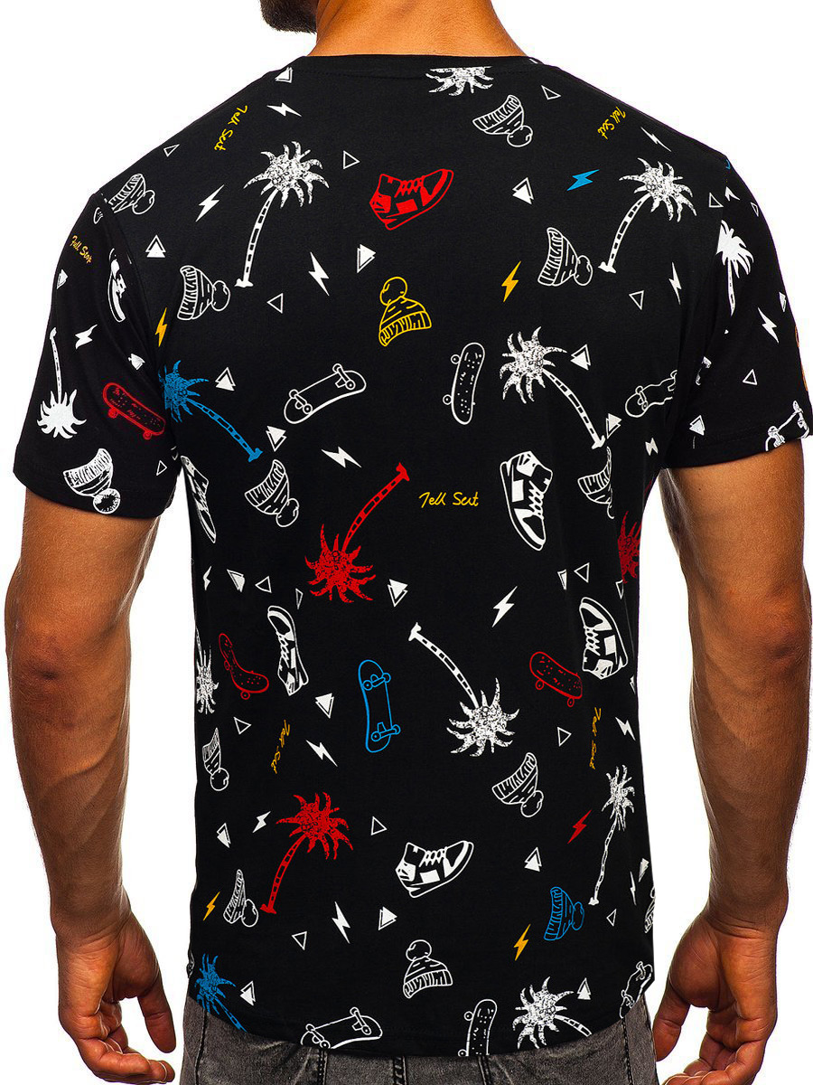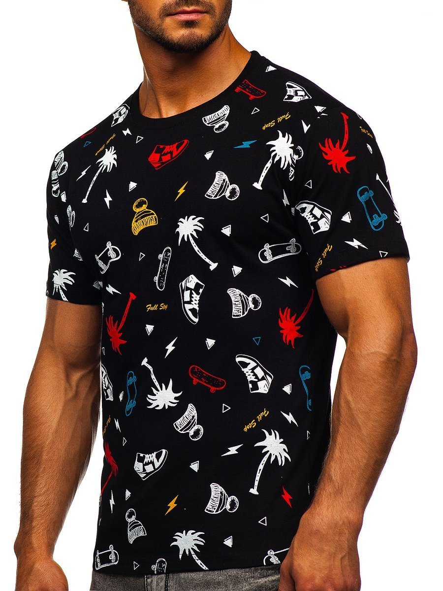 Tricouri bărbați negre din bumbacBolf. Sunt imprimate în model mărunt cu motiv de skateboard, palmieri, șepci și încălțăminte sportivă . T-shirtul negru cu imprimeu se potrivește ideal în ținutele zilnice cu jeanși sau joggers.