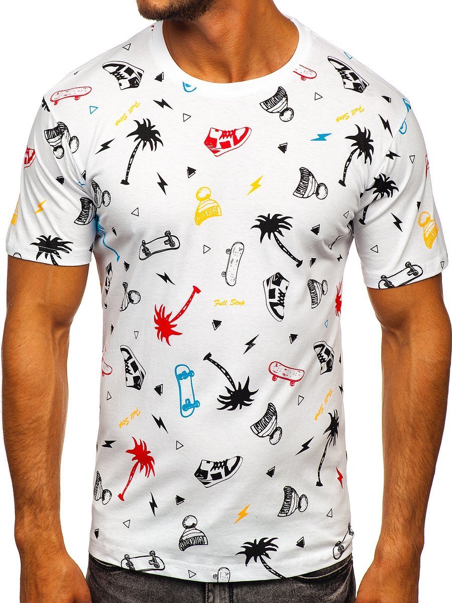 Tricouri albe din bumbac Bolf . Sunt imprimate în model mărunt cu motiv de skateboard, palmieri, șepci și încălțăminte sportivă . T-shirtul alb cu imprimeu se potrivește ideal în ținutele zilnice cu jeanși sau joggers.