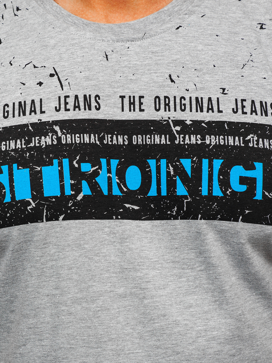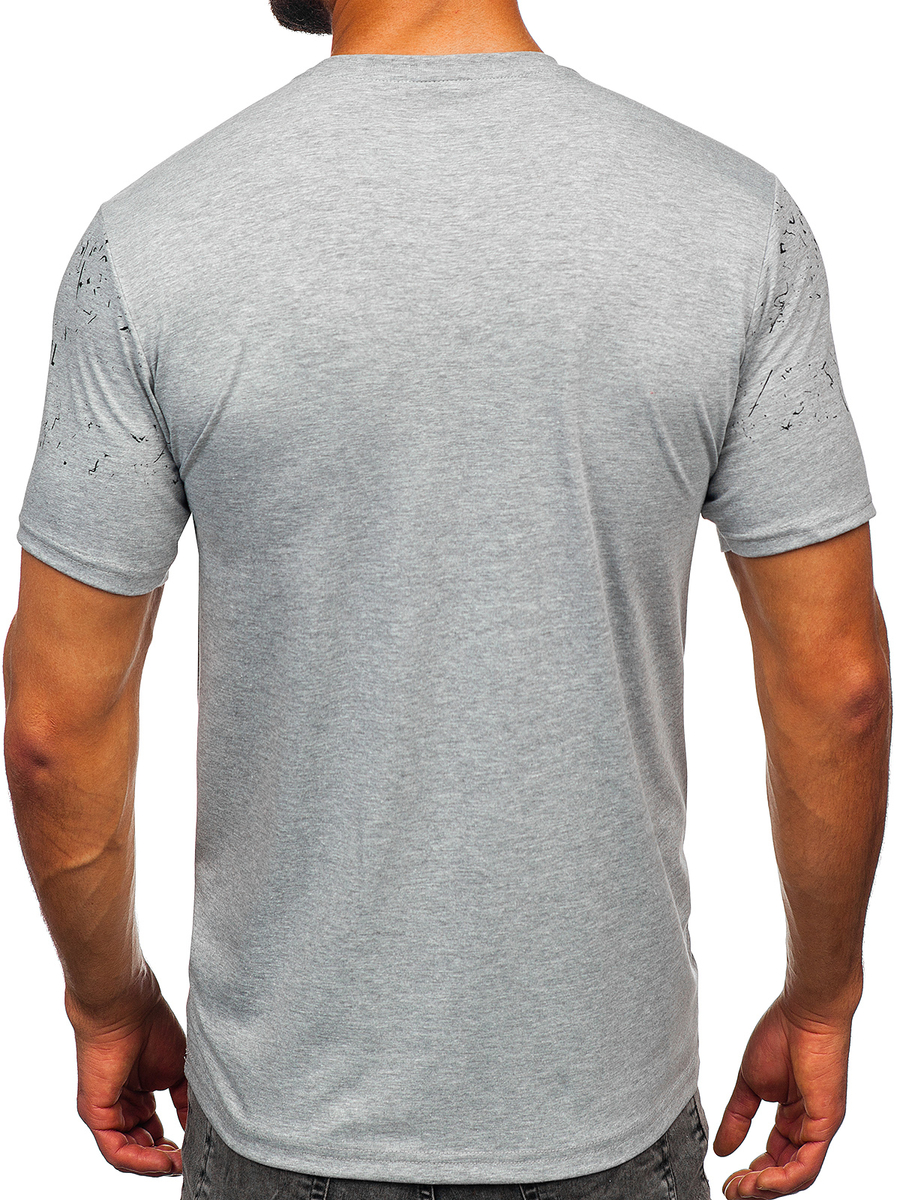 Tricouri ușoare Bolf din bumbac, pentru bărbați culoare gri. Stilate, se așează excelent pe silueta masculină, au print mare în partea frontală și mâneci imprimate. Tricoul gri cu imprimeu se potrivește în seturile informale. Combină cu jeanși, poartă cu șorți, joggers, pantaloni baggy.