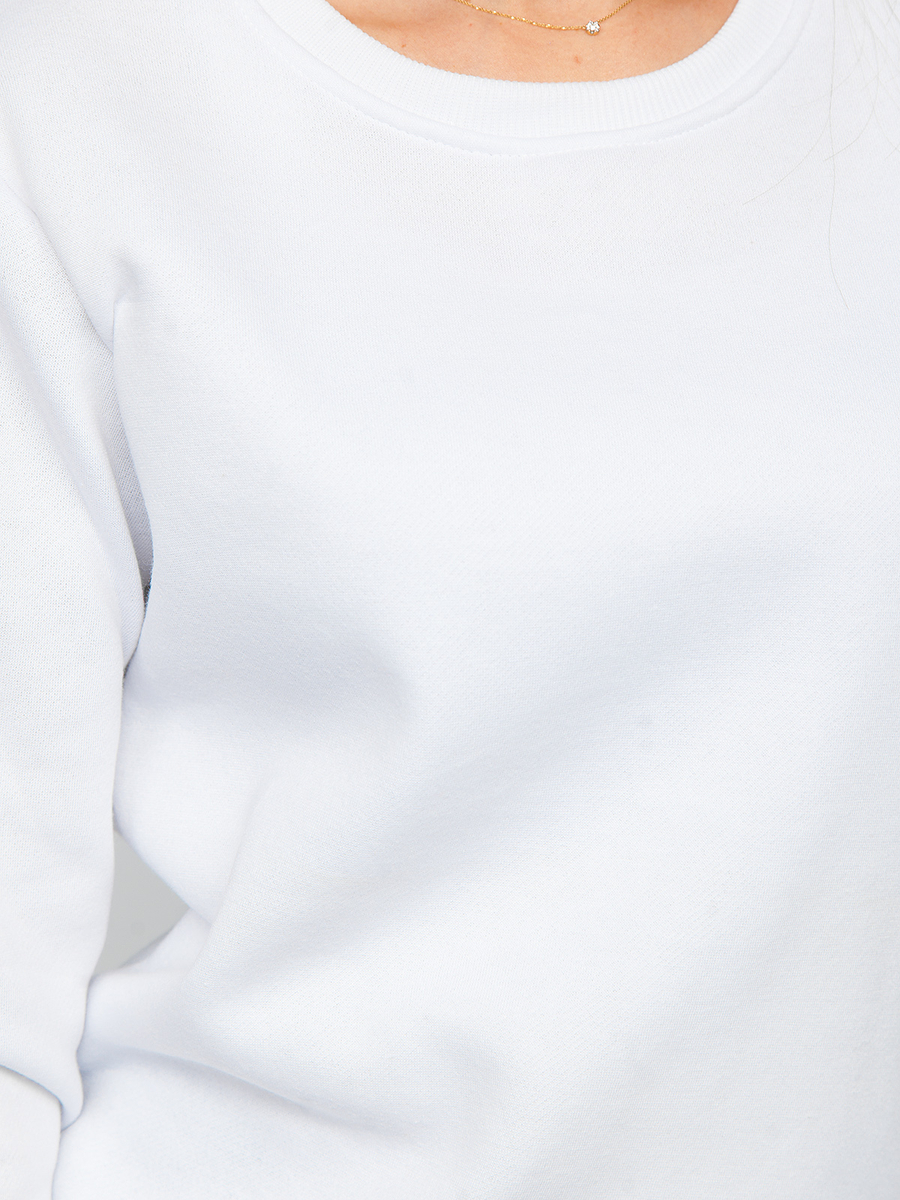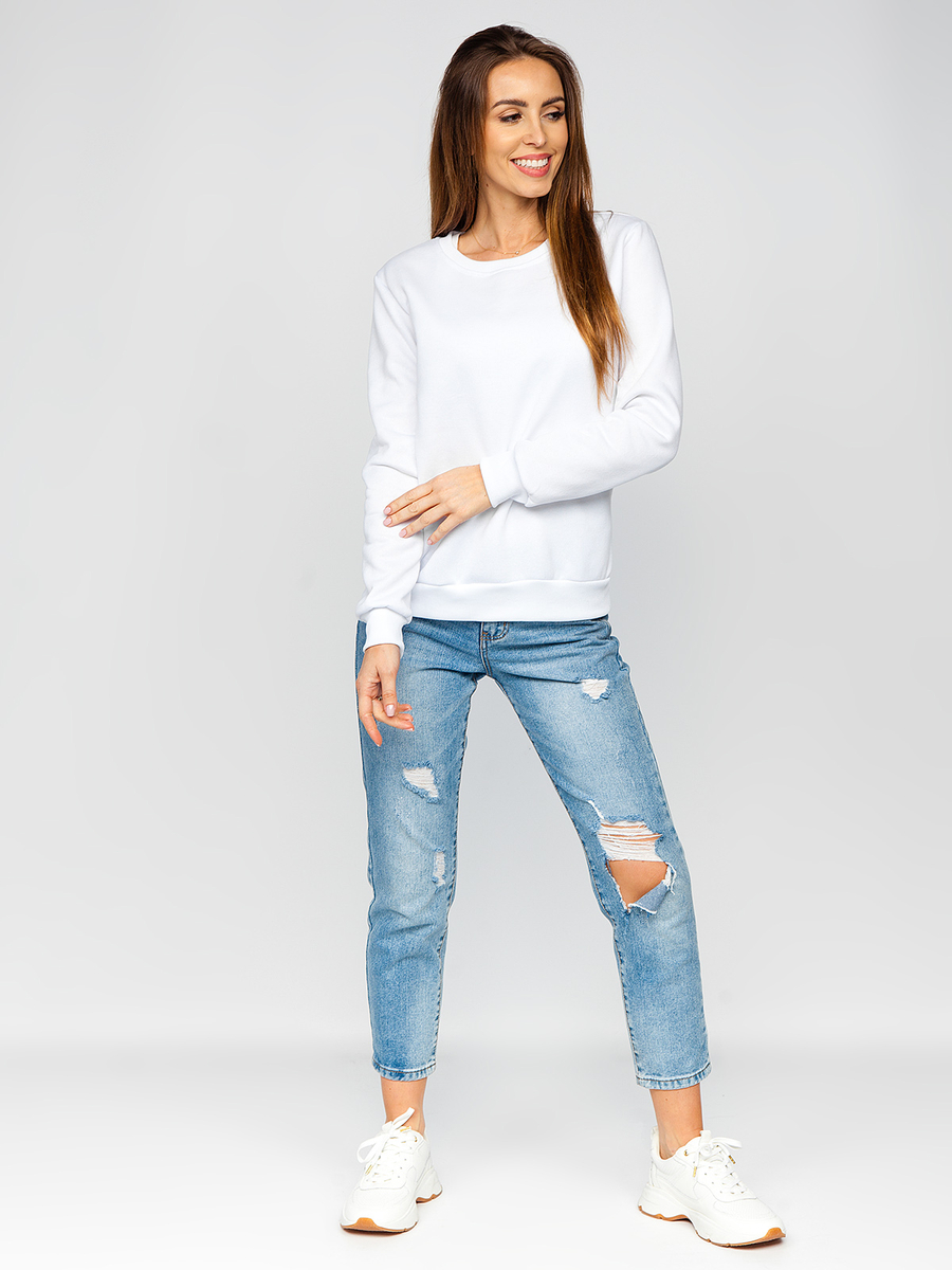 Bluza dame albă Bolf W01 confecționată în stil minimalist. Acest model clasic va arăta excelent pe orice siluetă feminină. Confecționată din material plăcut este netedă. La terminatie și mâneci cu elastice. Bluza nu are glugă, decolteu rotunjit cu dungă de aceeși culoare. Acest model basic se va potrivi în combinare cu alte articole din garderobă.