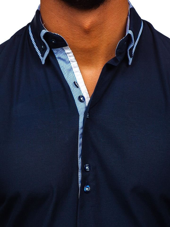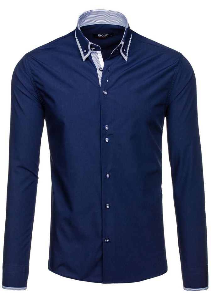 Cămăși elegante bluemarin pentru bărbat de la Bolf cu guler dublu foarte efectiv button down. Inserțiile în dungi excelent se combină cu bluemarinul formal. Cămașa bluemarin slim fit subțiază frumos silueta, evidențiază umerii. Evidențiază genial look-ul cu jeanși și cizme.