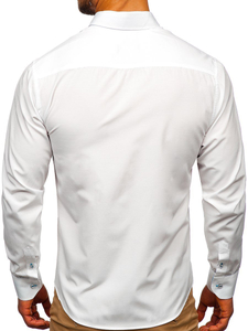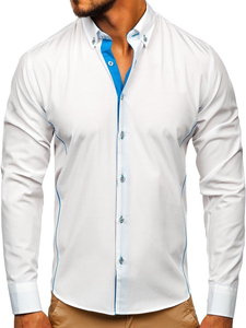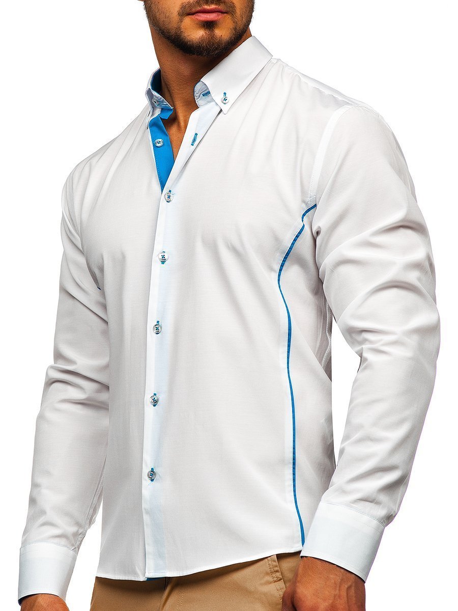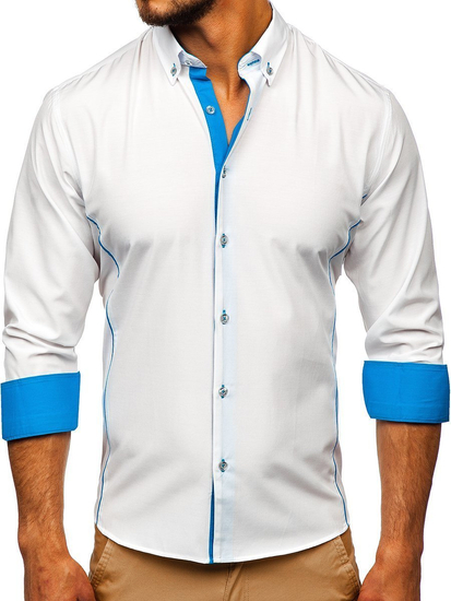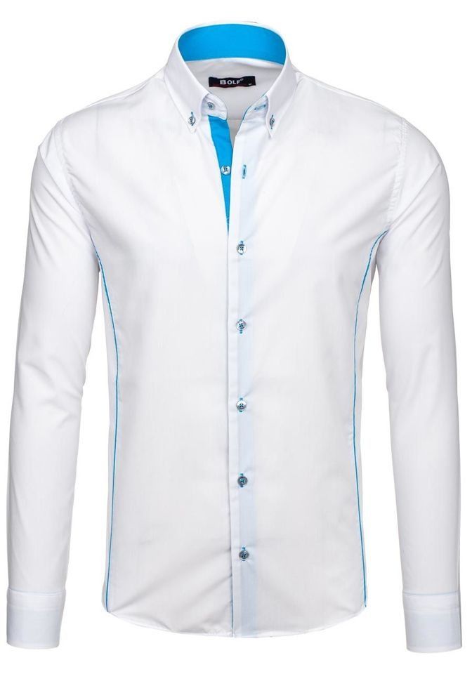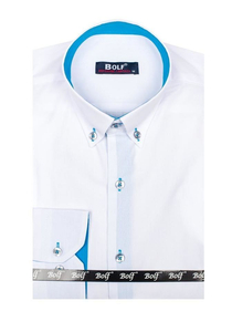 Cămăși stilate pentru bărbat alb-albastre de la Bolf. Croiala slim fit subțiază silueta, inserțiile albastre o evidențiază suplimentar. Cămașa albă-albastră pentru bărbat are guler frumos button down. Arată excelent în diverse stilizări. Cu sacou, jeanși, geacă de piele.