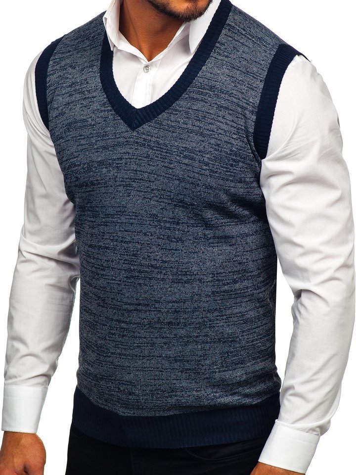 Pulover stilat bluemarin pentru bărbat, fără mâneci de la Bolf. Se potrivește excelent pe siluetă, comod și stilat. Puloverul bluemarin cu decolteu în V arată genial în pereche cu cămașă clasică. Îmbracă în zilele reci de asemenea cu sacou.