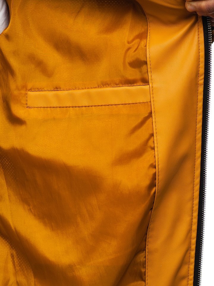 Geaca de piele Bolf 6125 culoare camel este expresivă și se poarta excelent. Geaca este confecționată din piele ecologică. Închidere cu fermoar și are guler tip tunica. Mânecile, gulerul și terminatia gecii cu elastice negre. Produsul are două buzunare exterioare cu fermoar și un buzunar interior fără fermoar.Geacă stil casual, ideală zilnică și pentru zilele cu soare primavara. Se potrivesc de asemenea la plimbare, întalnire cu prietenii, iesire în oras sau întalnire. Poti combina de asemenea cu pantaloni si Tricou, pantaloni chinos si cămasachiar cu blugi si pulover.