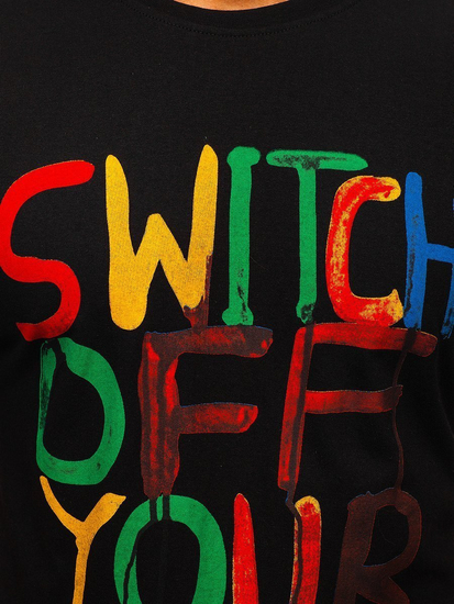 Tricoul negru cu imprimeu Bolf 1181 are imprimeu mare colorat in față. Inscripții excelente în partea din față. Tricoul are croiala clasică și decolteu rotunjit terminat cu dungă. La spate este neted.