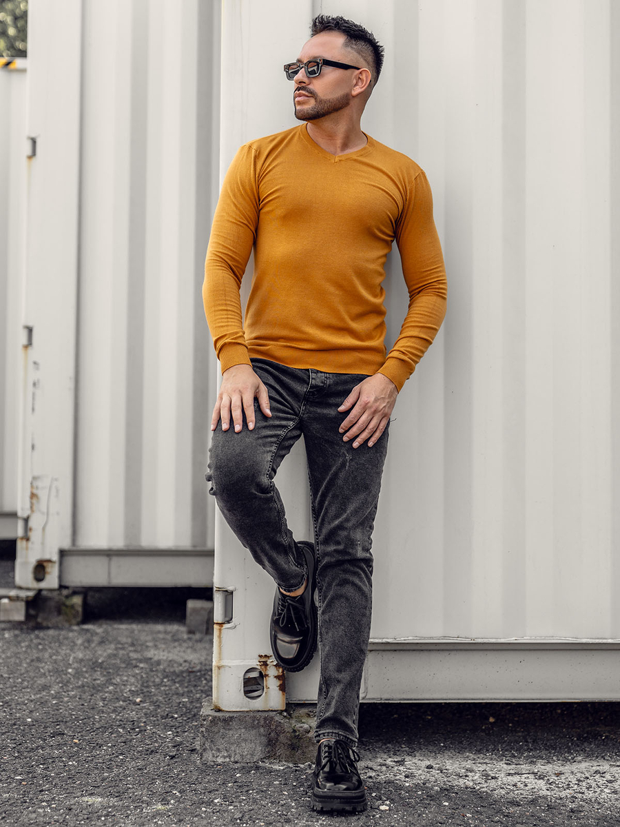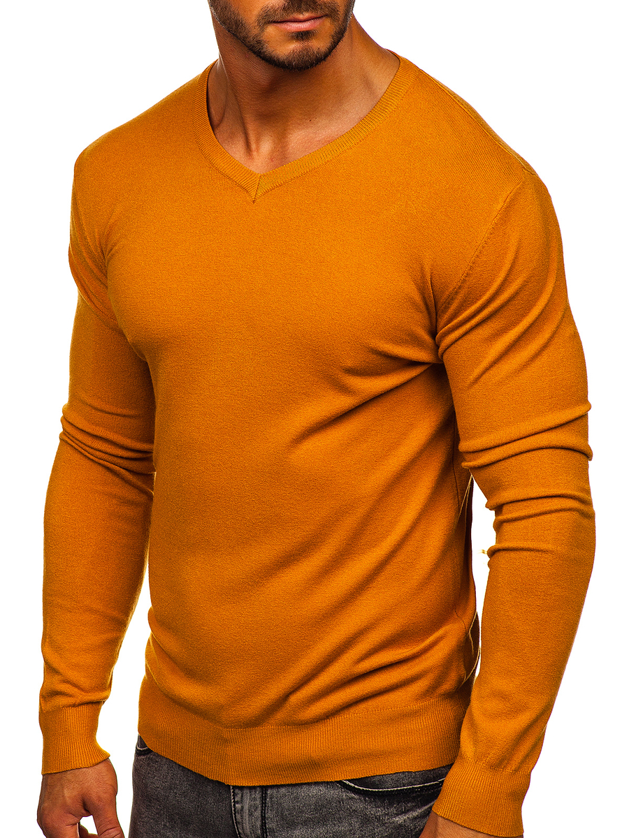 Puloverul bărbătesc Bolf YY03, de culoare cămilă, cu decolteu în V, are o croială simplă și clasică. Are decolteu delicat finisat cu elastic. Mânecile la fel au fost finisate cu elastic, datorită acestui lucru se va așeza excelent pe fiecare siluetă. Confecționat din material moale plăcut la atingere, se așează excelent pe siluetă. Material 32% acril, 27% poliester, 23% nylon și 18% vascoză. Acest produs a fost confecționat în diverse variante coloristice se va combina în mai multe ținute. Poartă la școală, serviciu– datorită acestui lucru il poți combina în diverse ținute. Puloverul clasic arată excelent cu blugi și geacă de piele, creează un outfit ideal in oraș. Poți combina cu joggers și bluză, creează o ținută relaxată.