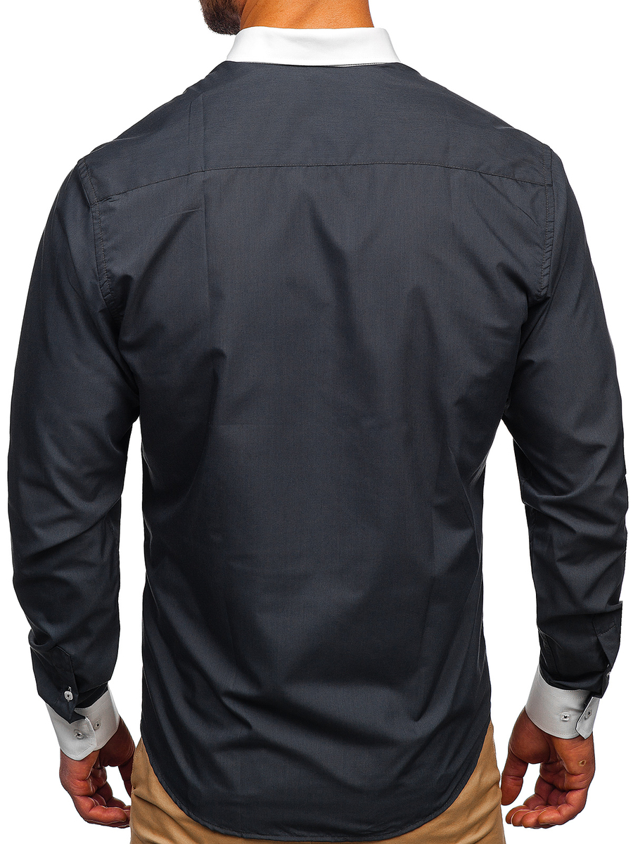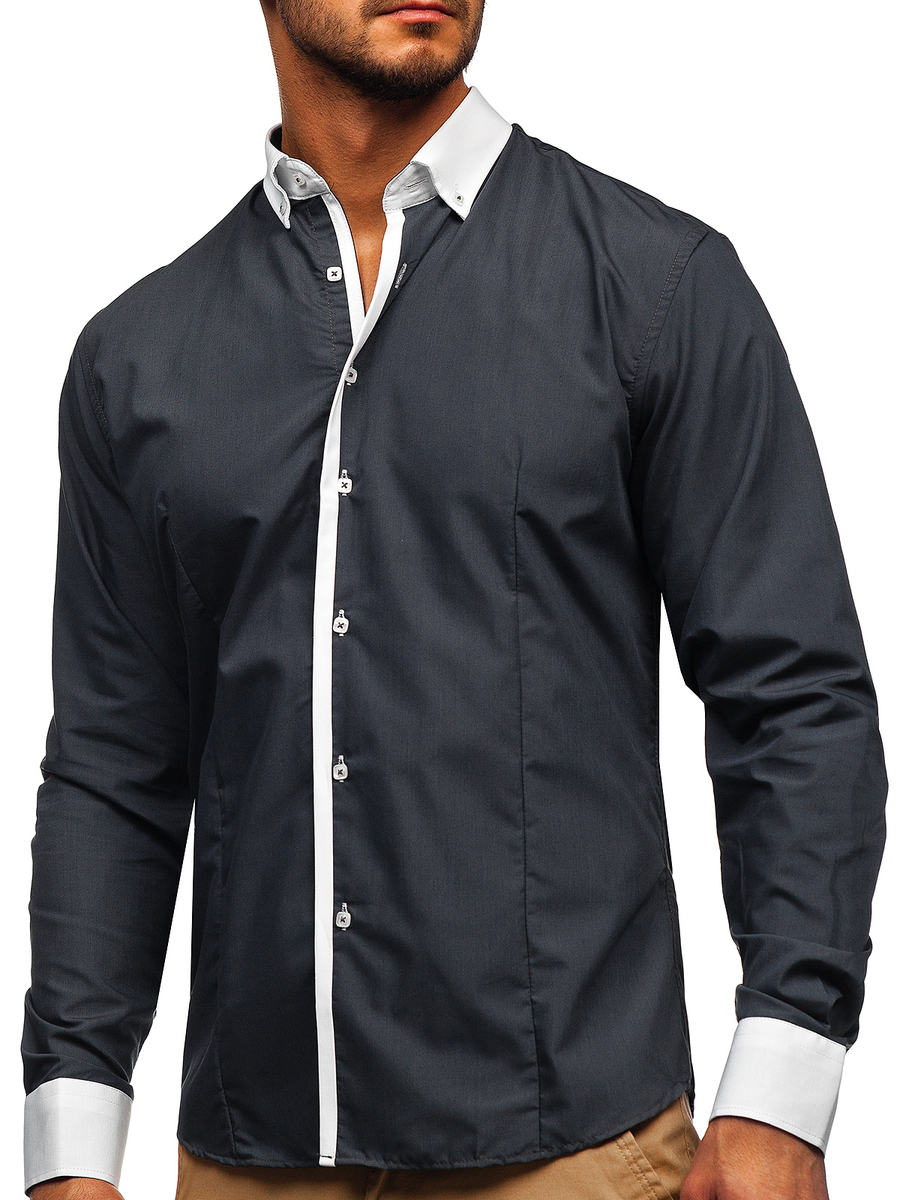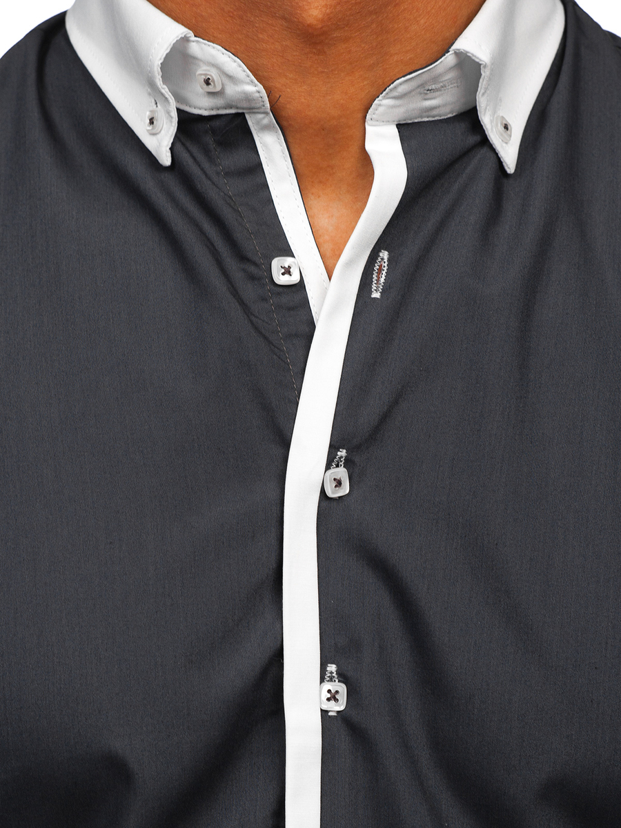 Cămăși elegante grafit Bolf cu manșete contrastante, guler și inchidere. Sunt stilate, slim, potrivite pentru diverse ocazii. Cămașă grafit cu mâneca lungă modelează silueta, evidențiază umerii. Are guler italian, foarte stilat.