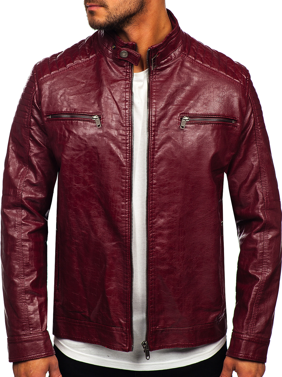Geaca bordo de piele se va potrivi in ținutele zilnice și ocaziile formale. Este originala si cu siguranta va atrage privirile. Combină cu pantaloni joggers, și blugi, va arăta excelent cu pantaloni chinos si sacou ori pulover