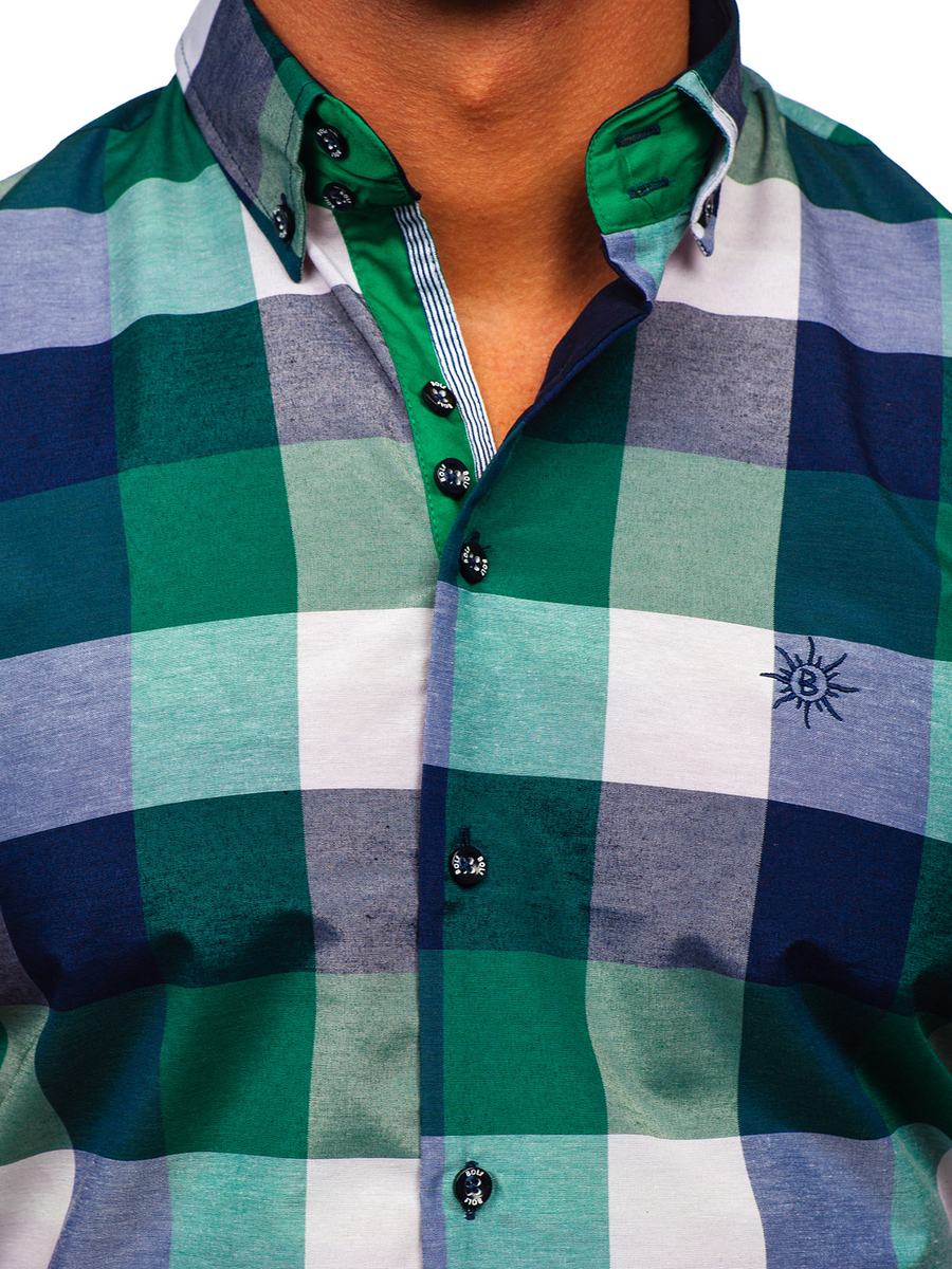 Cămăși excelente verzi cu mâneca scurtă slim fit de la Bolf în carouri evidențiate. Cu guler stilat la nasturi, terminația rotunjită, perfect evidențiază silueta bărbatului. Cămașă verde în carouri arată genial în outfit-urile cu jeanși, șorți denim sau pantaloni chino.