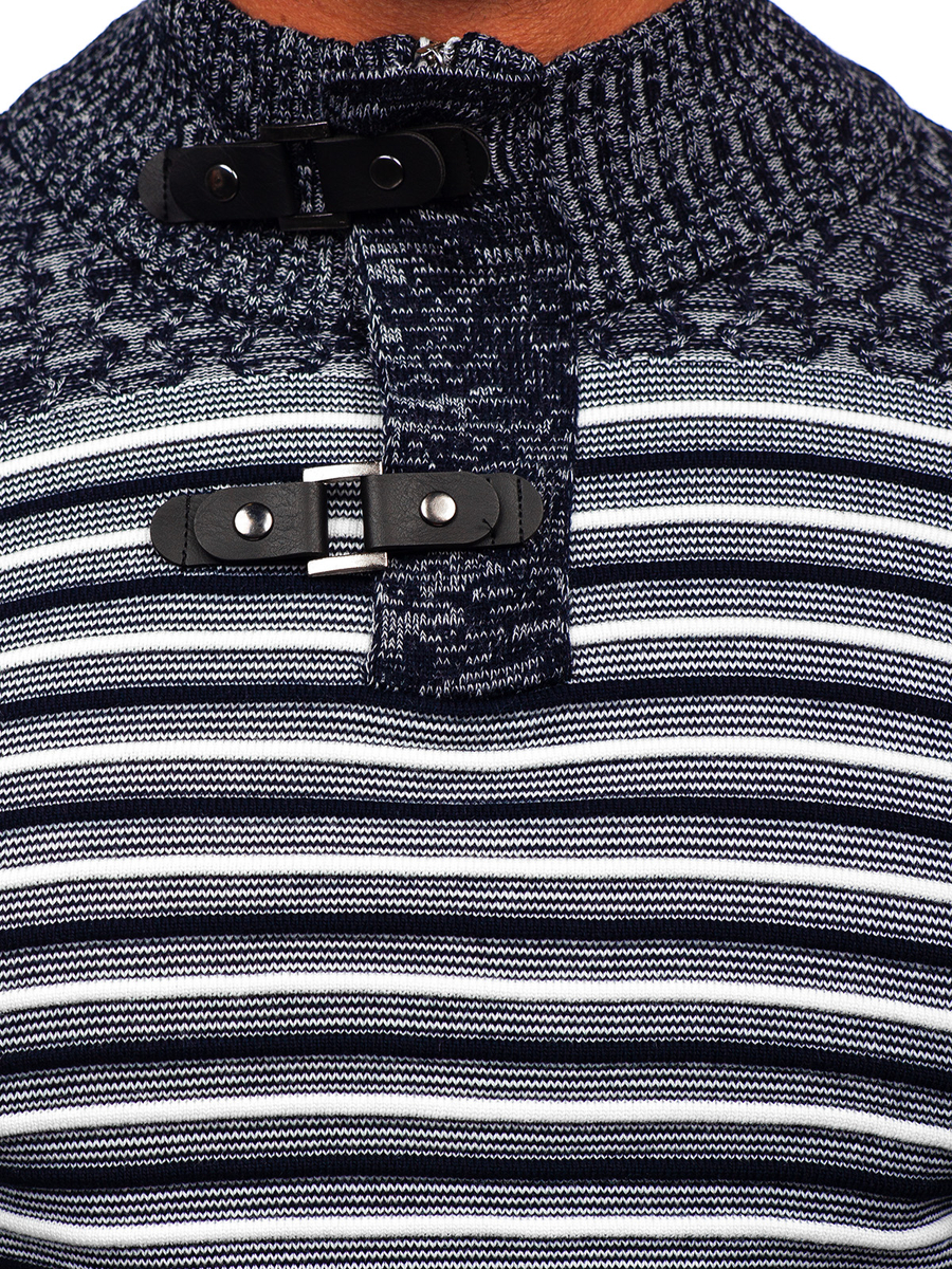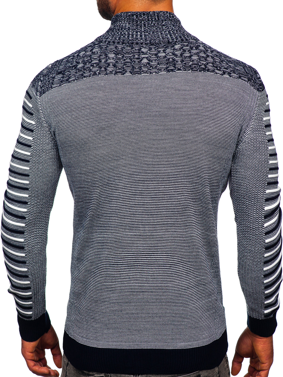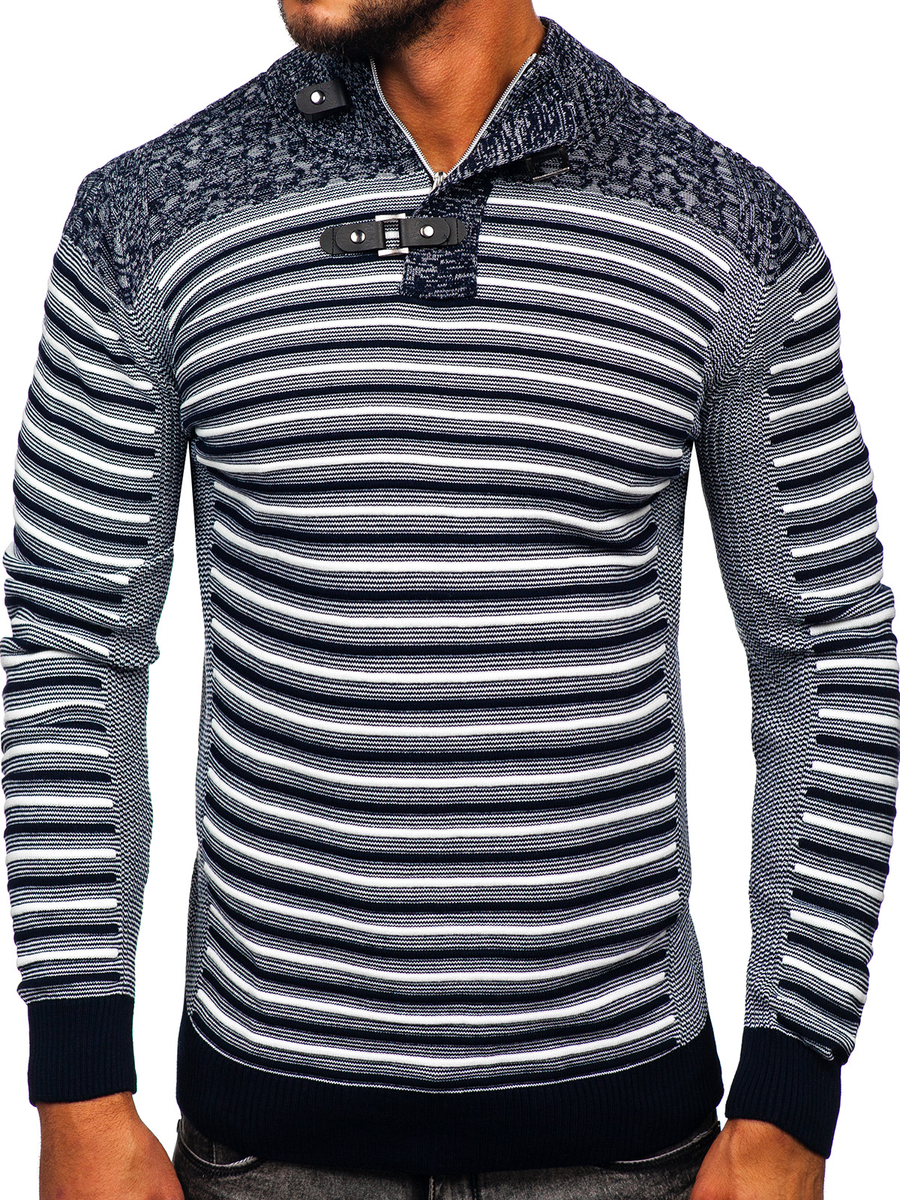 Pulover bleumarin Bolf 1028 este pulover cu croiala clasică. Are guler delicat tip tunică cu inchidere la fermoar și nasturi. Finisarea și mânecile cu elastice, datorită căreia se va potrivi excelent pe fiecare siluetă. Confecționat din 50% lână și 50% acril. Acest model a fost confecționat in trei variante coloristice, la sigur vei putea alege ceva. Dungile conferă caracter. Datorită culorilor vei putea combina in diverse ținute inchise sau mai deschise. Îmbracă la serviciu sau intalnire cu prietenii, școala sau plimbare- se va potrivi la multe ocazii. Poți combina cujoggers si geacă bomber,creând o ținută de seară. Puloverul clasic se va combina excelent cu pantaloni chinos si geacă de piele,creând un outfit ideal la intalnire cu prietenii.