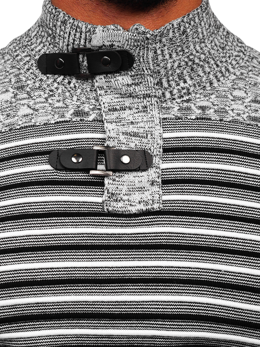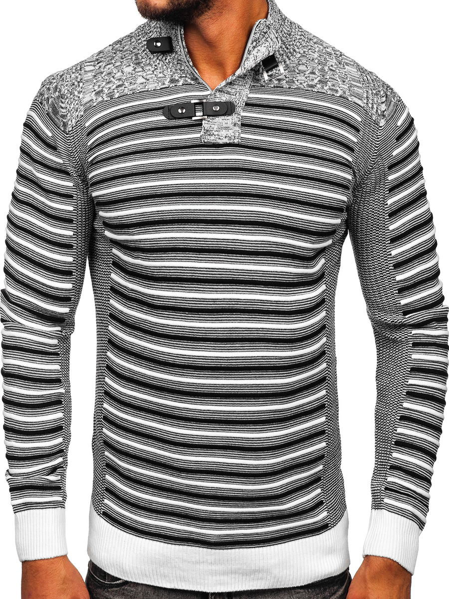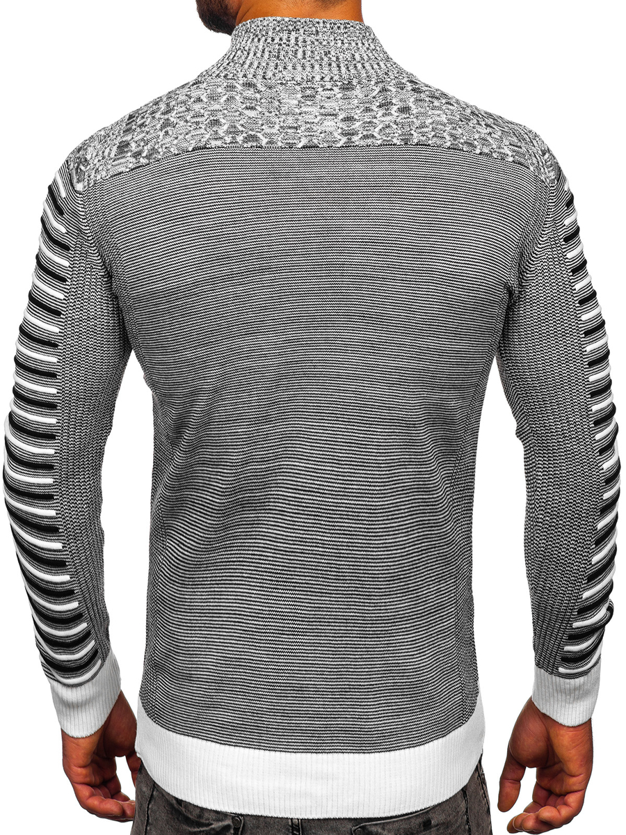 Puloverul alb Bolf 1028, este un pulover croiala clasică. Are guler delicat tip tunică cu inchidere la fermoar și nasturi. Finisarea și mânecile cu elastice, datorită căreia se va potrivi excelent pe fiecare siluetă. Confecționat din 50% lână și 50% acril. Acest model a fost confecționat in trei variante coloristice, la sigur vei putea alege ceva. Dungile conferă caracter. Datorită culorilor vei putea combina in diverse ținute inchise sau mai deschise. Îmbracă la serviciu sau intalnire cu prietenii, școala sau plimbare- se va potrivi la multe ocazii. Poți combina cujoggers si geacă bomber,creând o ținută de seară. Puloverul clasic se va combina excelent cu pantaloni chinos si geacă de piele,creând un outfit ideal la intalnire cu prietenii.