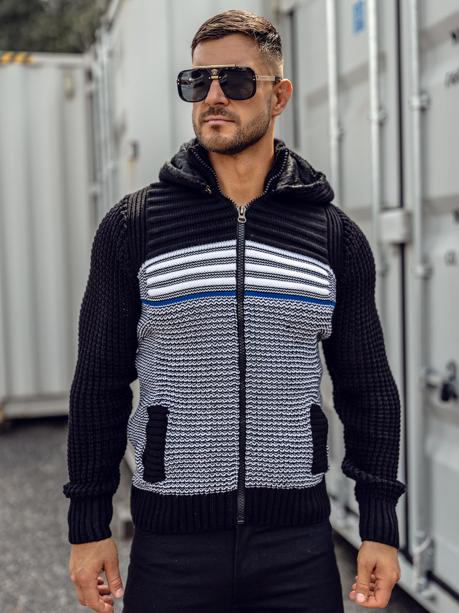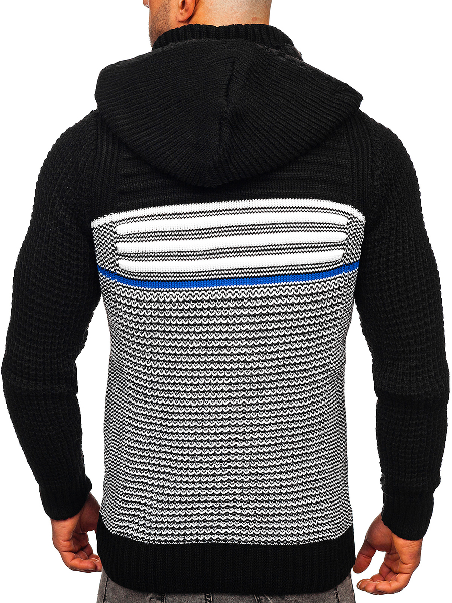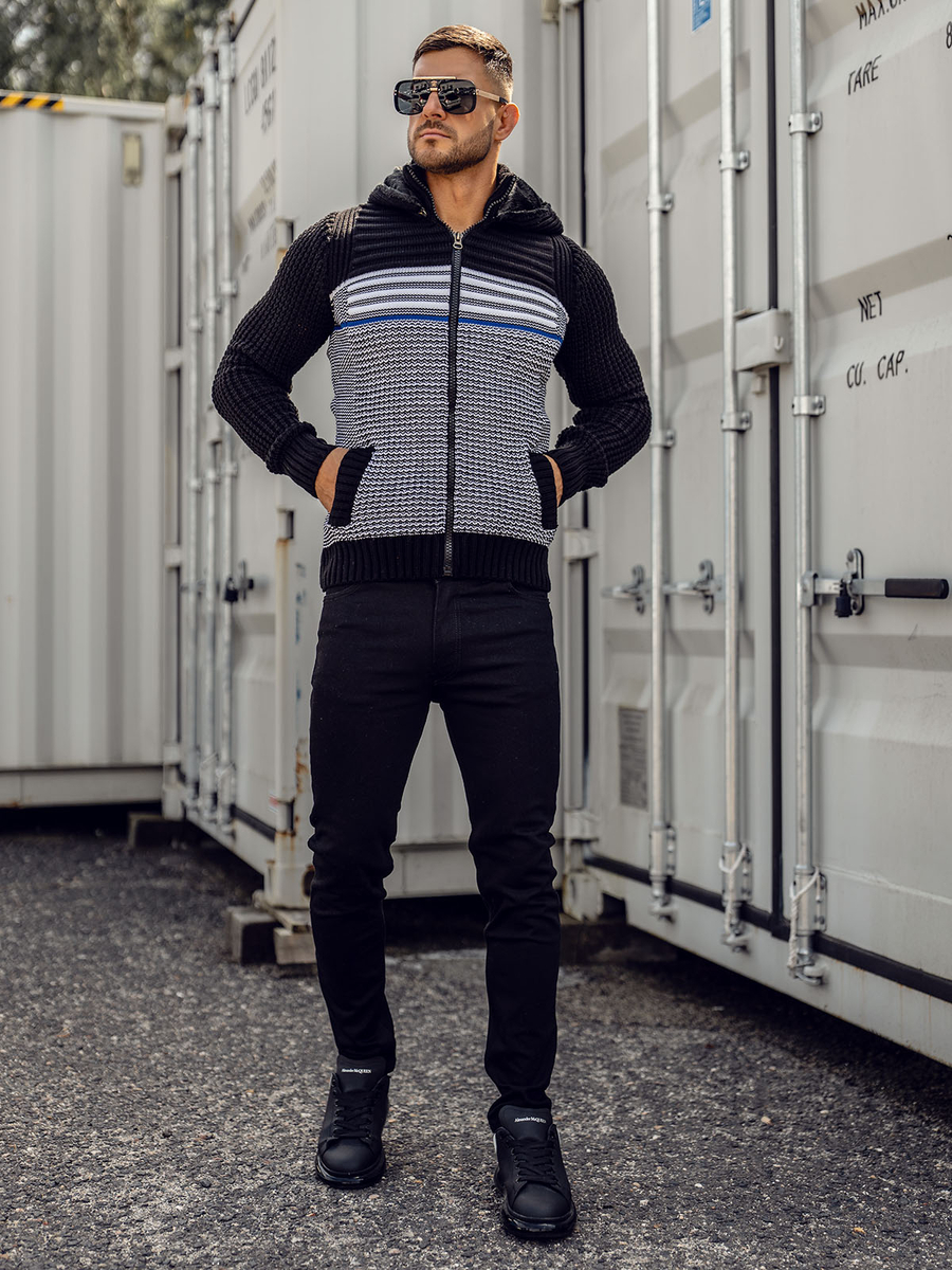 Pulover negru gros cu fermoar și glugă Bolf 2048 are inchidere cu fermoar. Confecționat in trei variante coloristice. Mânecile la fel au fost finisate cu elastic, datorită acestui lucru se va așeza excelent pe fiecare siluetă. Material plăcut la atingere ce conferă senzația de confort la purtare. Produsul confecționat din 70% acril și 30% lână. Acest model are buzunar practic cu glugă detașabilă și două buzunare lateralte. Croiala produsului permite să combini in mai multe țintue. Îmbracă la serviciu sau intalnire in familie. Uimește koszulą oraz chinosami. Dacă prețuiești ținutele libere, combină atunci puloverul cu Tricou sau blugi
