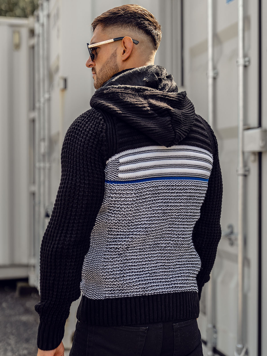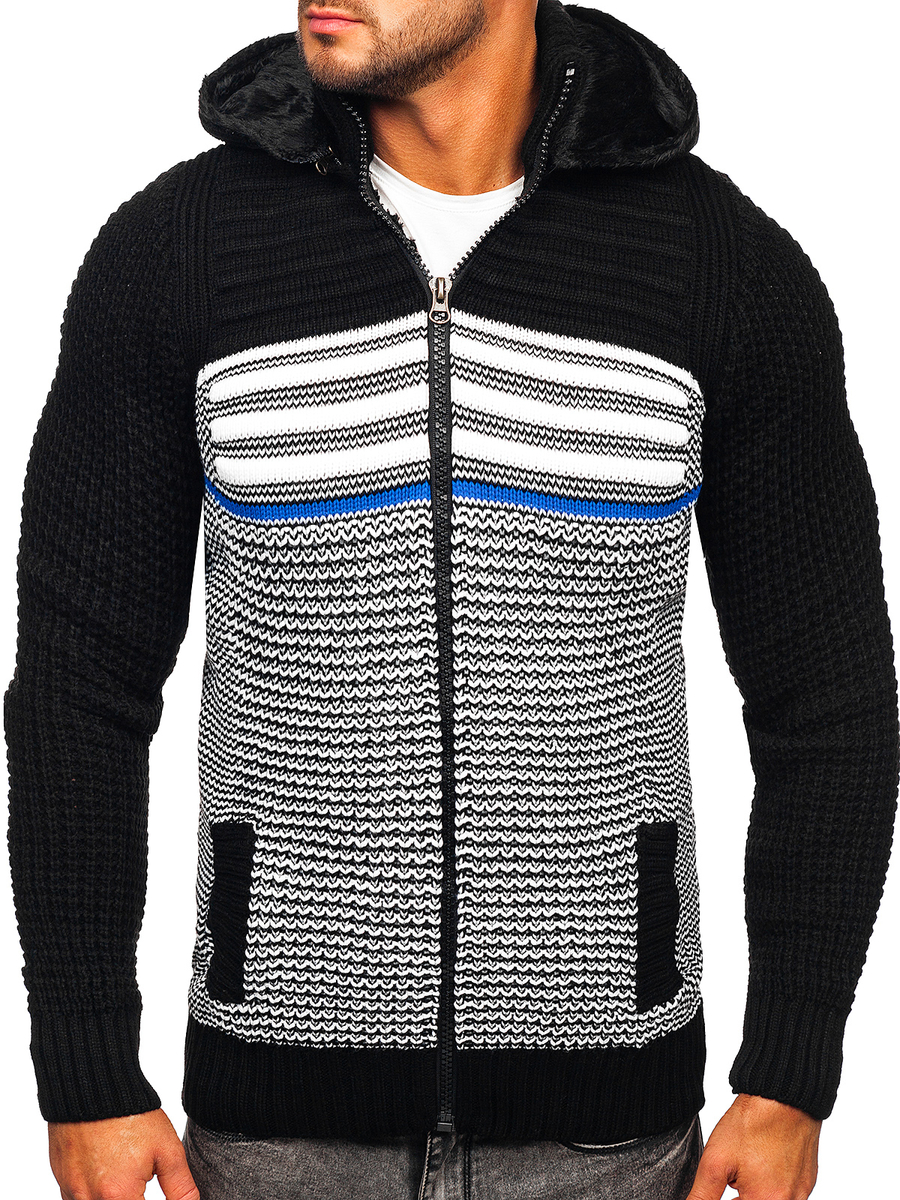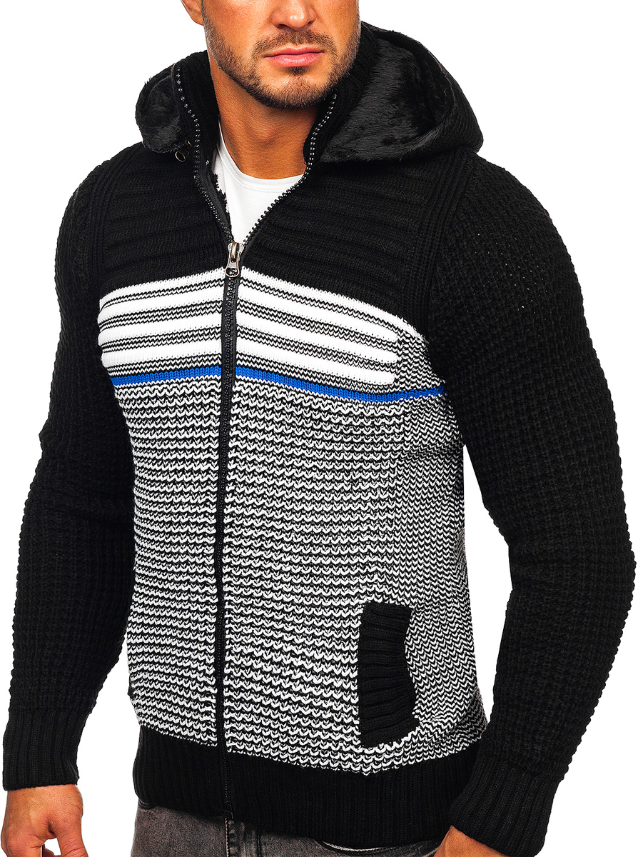 Pulover negru gros cu fermoar și glugă Bolf 2048 are inchidere cu fermoar. Confecționat in trei variante coloristice. Mânecile la fel au fost finisate cu elastic, datorită acestui lucru se va așeza excelent pe fiecare siluetă. Material plăcut la atingere ce conferă senzația de confort la purtare. Produsul confecționat din 70% acril și 30% lână. Acest model are buzunar practic cu glugă detașabilă și două buzunare lateralte. Croiala produsului permite să combini in mai multe țintue. Îmbracă la serviciu sau intalnire in familie. Uimește koszulą oraz chinosami. Dacă prețuiești ținutele libere, combină atunci puloverul cu Tricou sau blugi