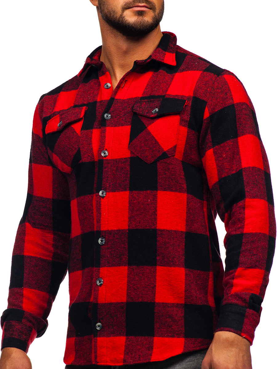 Cămașa neagră-roșu flanel cu mâneca lunga Bolf 20723 are nasturi cu inchidere. Cămașa are două buzunare cu inchidere la fermoar. Finisarea cămășii rotunjită. Are manșete cu inchidere la nasturi.