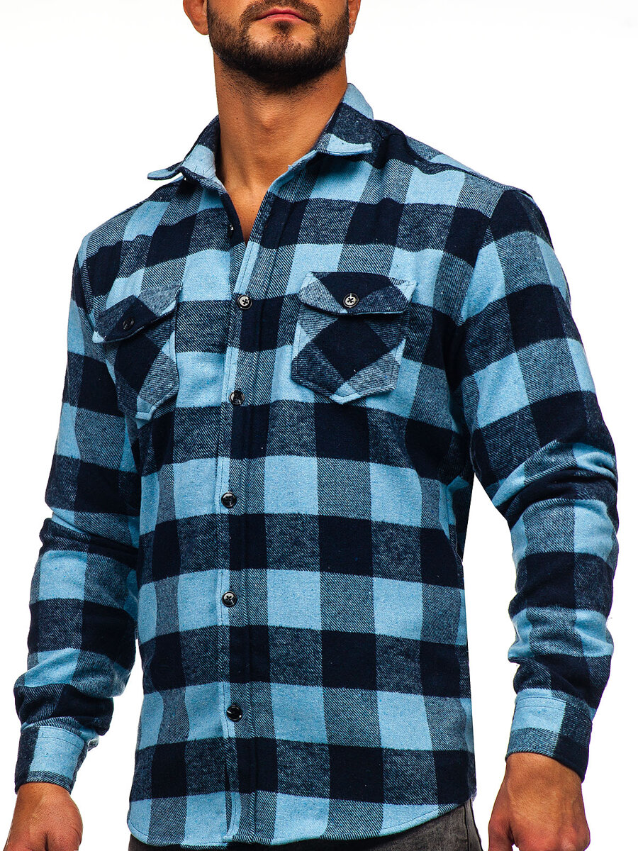Cămașa albastră flanel cu mâneca lunga Bolf 20723 are nasturi cu inchidere. Cămașa are două buzunare cu inchidere la fermoar. Finisarea cămășii rotunjită. Are manșete cu inchidere la nasturi.