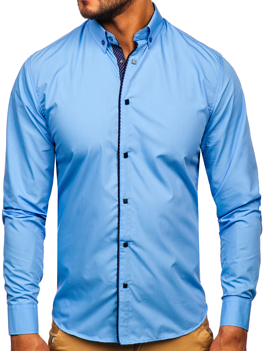 Cămăși albastre-deschis cu mâneca lungă și detalii contrastante. Stilate, comode, de înaltă calitate. Cămașa albastră-deschis pentru bărbat slim fit Bolf arată minunat cu jeanși și pantaloni chino. Are guler fain cu nasturi. Se potrivește excelent în outfit-urile stilate zilnic.