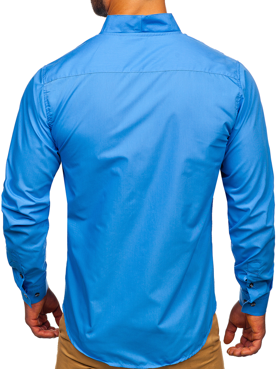 Cămăși slim fit albastre Bolf un model pentru cei curajoși. În loc de gulerul tradițional au guler tip tunică. Linia de nasturi este evidențiată subtil. Cămășile albastre cu mâneca lungă subțiază optic. Arată bine în multe stilizări.
