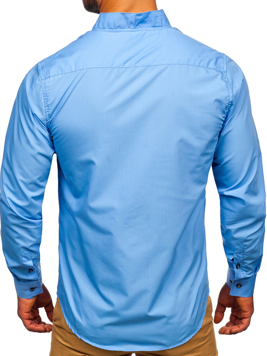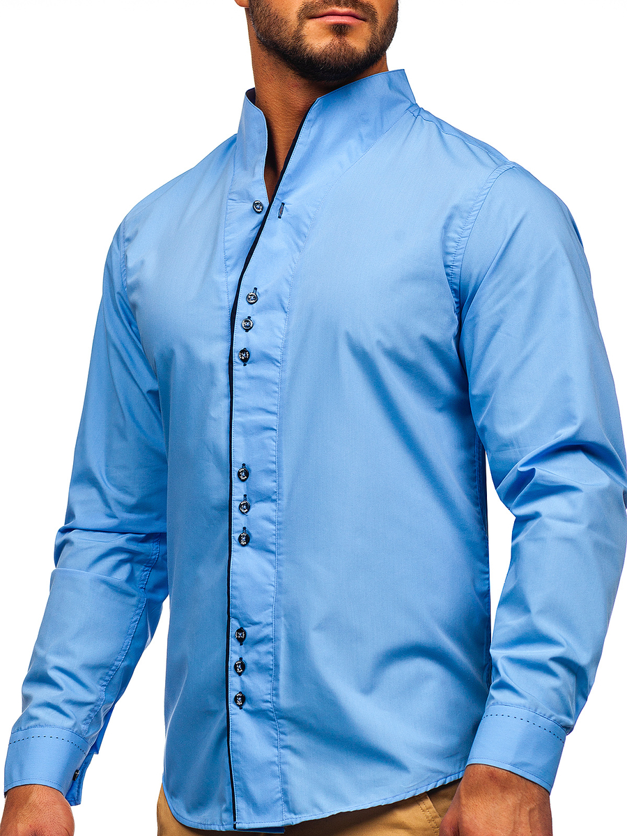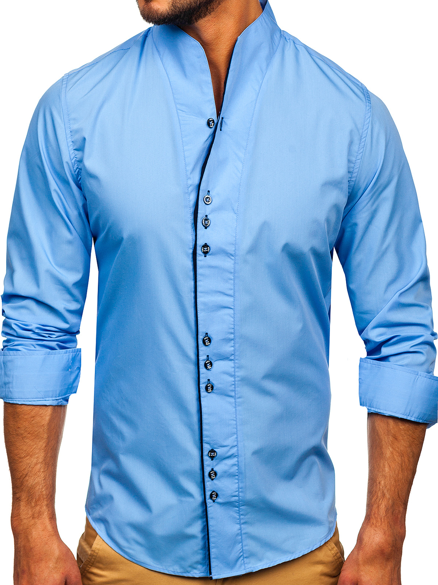 Cămașă albastră-deschis slim fit Bolf este un model pentru cei curajoși. În loc de gulerul tradițional au guler tip tunică. Linia de nasturi este evidențiată subtil. Cămășile albastre-deschis cu mâneca lungă subțiază optic. Arată bine în multe stilizări.