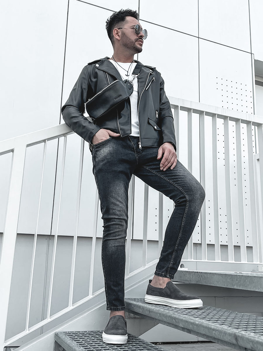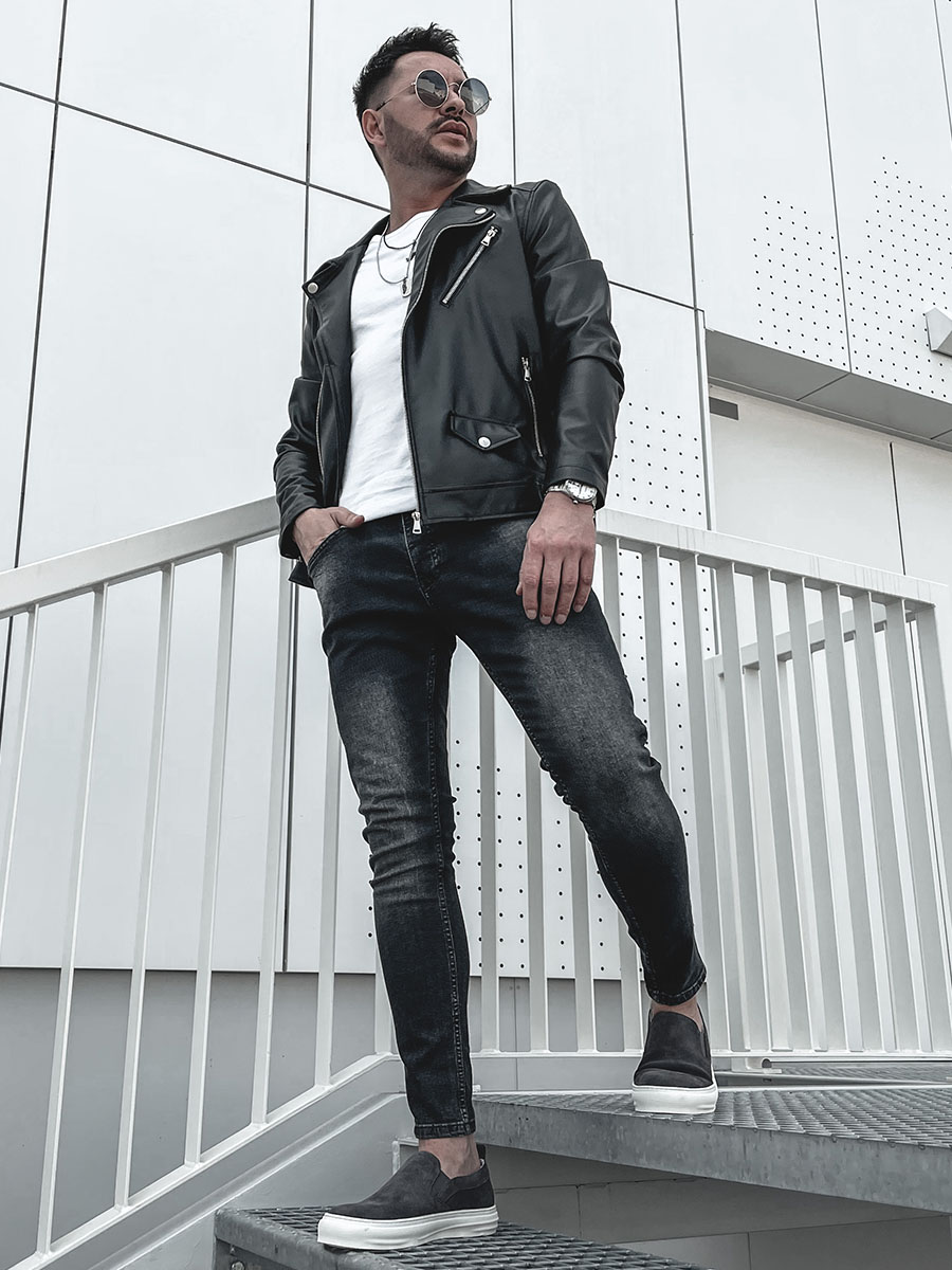 Geaca neagră de piele Bolf 0006 este alegerea excelentă pentru fanii ținutelor curajoase. Geaca neagră de piele deja de mai mulți ani este foarte populară. Se închide cu fermoar. Are două bzunare exterioare cu fermoar și imitare buzunar la piept cu fermoar. In partea de jos imitare buzunar. Finisarea reglabilă cu inchidere decorativă, mânecile reglabile cu fermoar. Produsul este destinat pentru fanii stilului casual. Se potriveste excelent la plimbări, intâlniri sau iesiri in oras Confecționat din piele ecologică Compoziție 50% z PFC, 40% poliester și 10% poliuretan. Excelent in combinare cubluză si blugi.