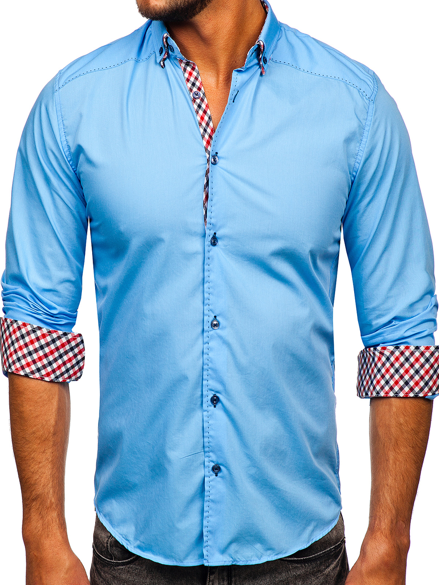 Cămăși albastre stilate cu mâneca lungă de la Bolfpentru ținutele zilnice. Stilate, țesături contrastante, guler frumos și detalii în carouri. Cămașă albastră pentru bărbat slim fit cu terminația rotunjită. O poți purta de asemenea cu pantaloni