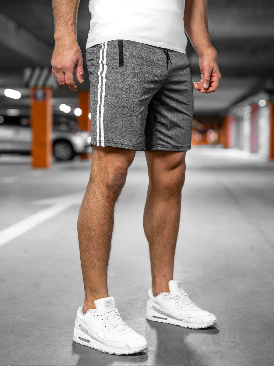 Pantalonii scurți de training grafit Bolf 68024 sunt reglabili în talie cu șnur puternic și elastic, se potrivesc excelent pe silueta masculina Au două buzunare practice exterioare cu fermoar. Confecționați din material de înaltă calitate, datorită căruia te vei simți comod. Elementul decorativ sunt dungile stilate pe laterală. Produsul a fost creat pentru persoanele ce prețuiesc confortul. Se va potrivi excelent la sală sau jogging. Combină stilul sport cu tricou și bluză. Va arăta fantastic cu geacă de blugiși pantaloni scurți.