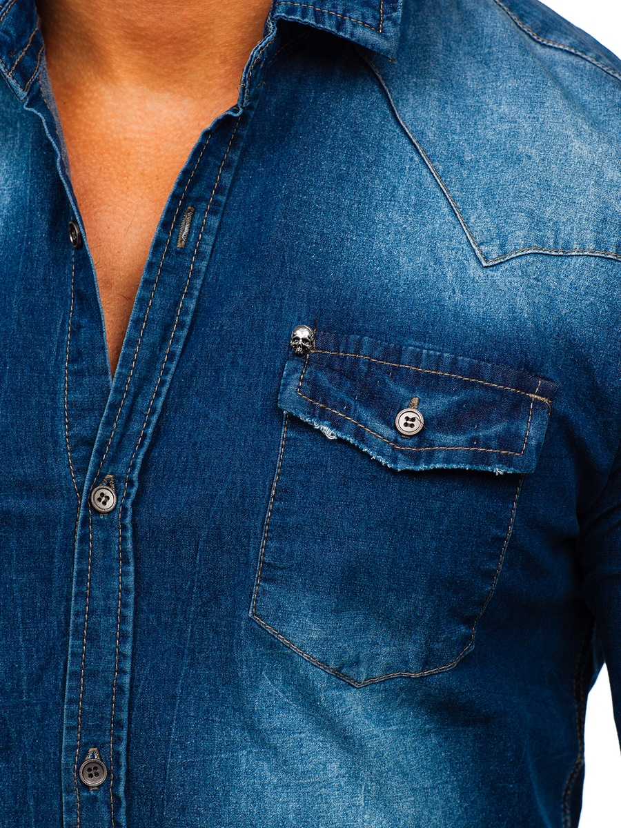 Niebieska koszula męska jeansowa z długim rękawem Denley MC704B to element garderoby każdego, eleganckiego mężczyzny. Koszula z długim rękawem, zapinana jest na guziki oraz posiada kołnierzyk "Hai". Uwielbiany przez naszych klientów fason z zaokrąglanym dołem koszuli świetnie dopasowuje się do sylwetki. Posiada regulowane, pojedyncze, zapinane na dwa guziki mankiety. Koszula posiada również dwie, praktyczne kieszenie piersiowe. Elementem ozdobnym jest mała aplikacja w kształcie czaszki przy kieszeni. Koszulę jeansową można wykorzystać podczas wielu okoliczności. Świetnie sprawdzi się podczas wyjść z przyjaciółmi do klubu, jak również podczas rodzinnego obiadu. Skomponuj swój elegancki look z chinosami oraz marynarką. Chcąc uzyskać bardziej casualowy outfit dobierz jeansy oraz kurtkę skórzaną, w takiej stylówce zawsze będziesz wyglądać modnie.