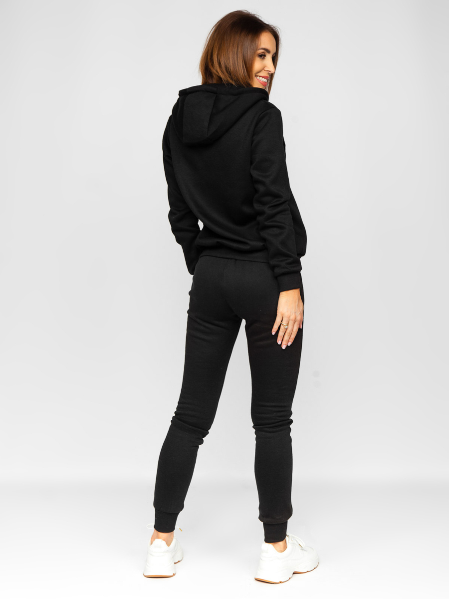 Compleu de training negru dame Bolf 0003 un model pentru fanii ținutelor sport. Setul cuprinde bluza și pantalonii. Bluza are închidere cu fermoar strălucitor, glugă reglabilă și două buzunare. Pantalonii de training au reglare în talie cu elastic puternic și șnur. Au două buzunare în față și finisare la picioare cu elastic, se va potrivi ideal pe siluetă Model sport comod și stilat. Produsul este confectionat din material placut la atingere. Îl poți purta la training în ținutele sport, escapade la munte, acasă sau zilnic Combină cu geacă, sport sau vestă.