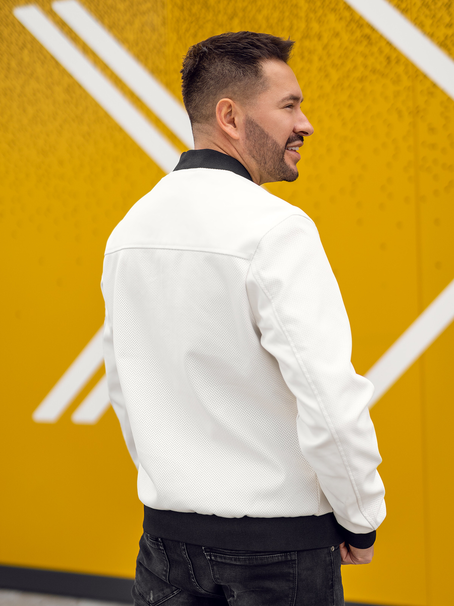 Geaca de piele albă Bolf 7110 are croiala clasică. Are închidere cu fermoar strălucitor și guler tip tunică finisare cu elastic. Două buzunare exterioare cu fermoar și buzunar interior va conferi un caracter practic. Terminație și mânecile finisare cu elastic care asigură căldură și protejează de vant. Geaca de piele are croiala universală, stil casual, se va potrivi la fiecare ocazie. Este confecționată din materiale combinate piele ecologică. Va arăta excelent combinată cu joggers, blugisau ținute mai relaxate pantaloni de trening.