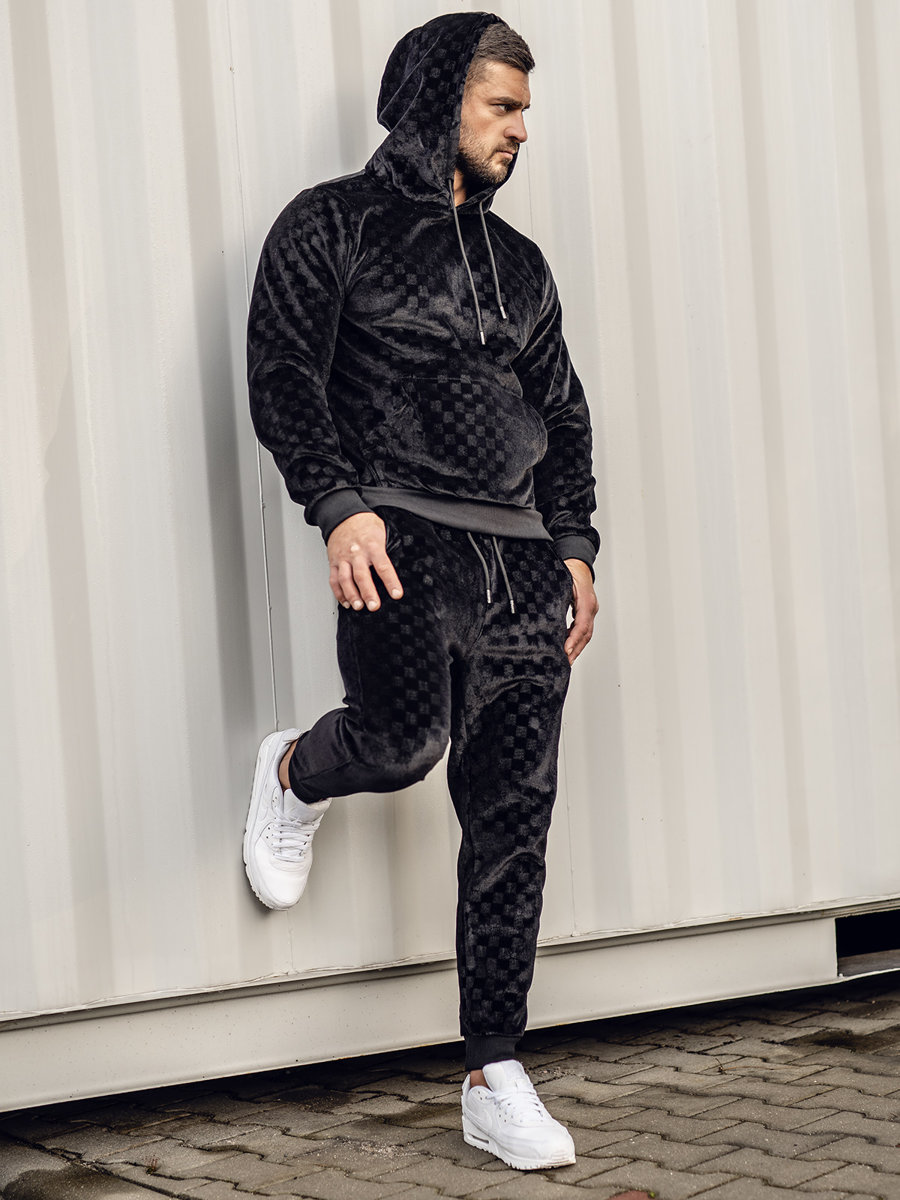 Trening negru catifea cu glugă Bolf 3A82 compleu de trening sport. Confecționat din catifea , treningul se va combina excelent în mai multe ținute-nu doar sport! Setul cuprinde hanorac și pantaloni . Pantalonii au reglare în talie cu elastic, șnur și două buzunare. Compleu de training poate fi folosit ca bază pentru a combina cu alte ținute sport. Atât hanoracul cât și pantalonii pot fi combinați cu alte articole ale garderobei, pentru a obține ținute excelente. Compleul se va potrivi ideal cuTricou si vestă.