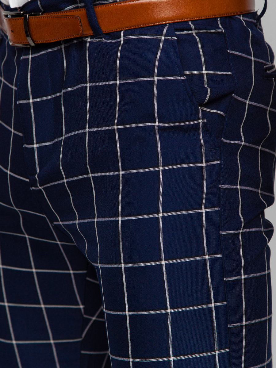Pantalonii chino pentru bărbați din țesătură în carouri bleumarin de la Bolf 0038 sunt perfecti pentru iubitorii unui look elegant. Pantalonii cu picior clasic, lung, se prind cu fermoar și nasture. Acest model are buzunare practice unde poți păstra diverse lucruri Două sunt situate în spate și două în față. Sunt realizate din materiale de cea mai înaltă calitate, ceea ce le face excepțional de confortabile și plăcute la atingere.Panourile chino sunt atemporale, confortabile, practice și arată întotdeauna bine.Asociați-le cu o jachetă de piele și un tricou și veți obține un look perfect pentru aproape orice ocazie.