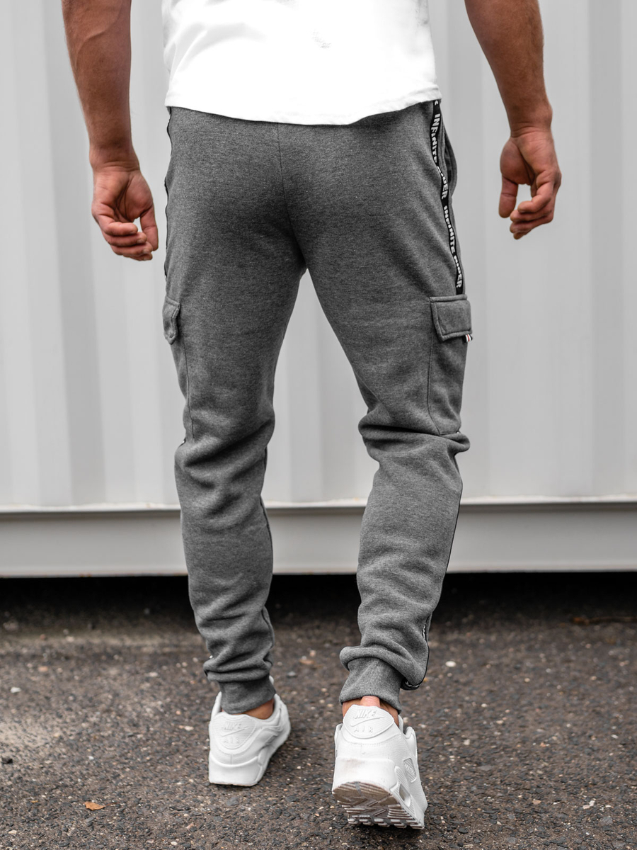 Pantalonii de trening gri pentru barbati Bolf JX8715B sunt un produs care va satisface fiecare suporter si fan al stilului sport in imbracaminte. Pantaloni cargo eleganți, sunt foarte populari de mai mulți ani Pantaloni reglabili in talie cu elastic și șnur. Datorită acestui lucru se potrivesc pe orice siluetă masculină. La șnur finisat cu elemente albe care se contrastează cu culoarea pantalonilor. Produsul are două buzunare practice și funcționale. Pot sluji pentru păstrarea documentelor sau telefonului. Pe laterală alte două buzunare. Au inscripție la modă. Inscripție de culoare albă care evidențiază pantalonii. Finisarea cu elastic la modă. Acest lucru asigură că pantalonii vor arăta stilat și proteja de căldură în zilele reci