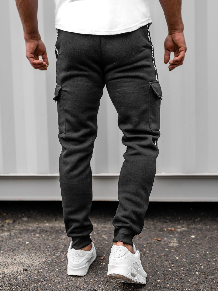 Pantalonii de trening pentru bărbați Bolf JX8715B negri sunt un produs care va satisface fiecare susținător și fan al stilului sport în îmbrăcăminte. Pantaloni cargo eleganți, sunt foarte populari de mai mulți ani Pantaloni reglabili in talie cu elastic și șnur. Datorită acestui lucru se potrivesc pe orice siluetă masculină. La șnur finisat cu elemente albe care se contrastează cu culoarea pantalonilor. Produsul are două buzunare practice și funcționale. Pot sluji pentru păstrarea documentelor sau telefonului. Pe laterală alte două buzunare. Au inscripție la modă. Inscripție de culoare albă care evidențiază pantalonii. Finisarea cu elastic la modă. Acest lucru asigură că pantalonii vor arăta stilat și proteja de căldură în zilele reci