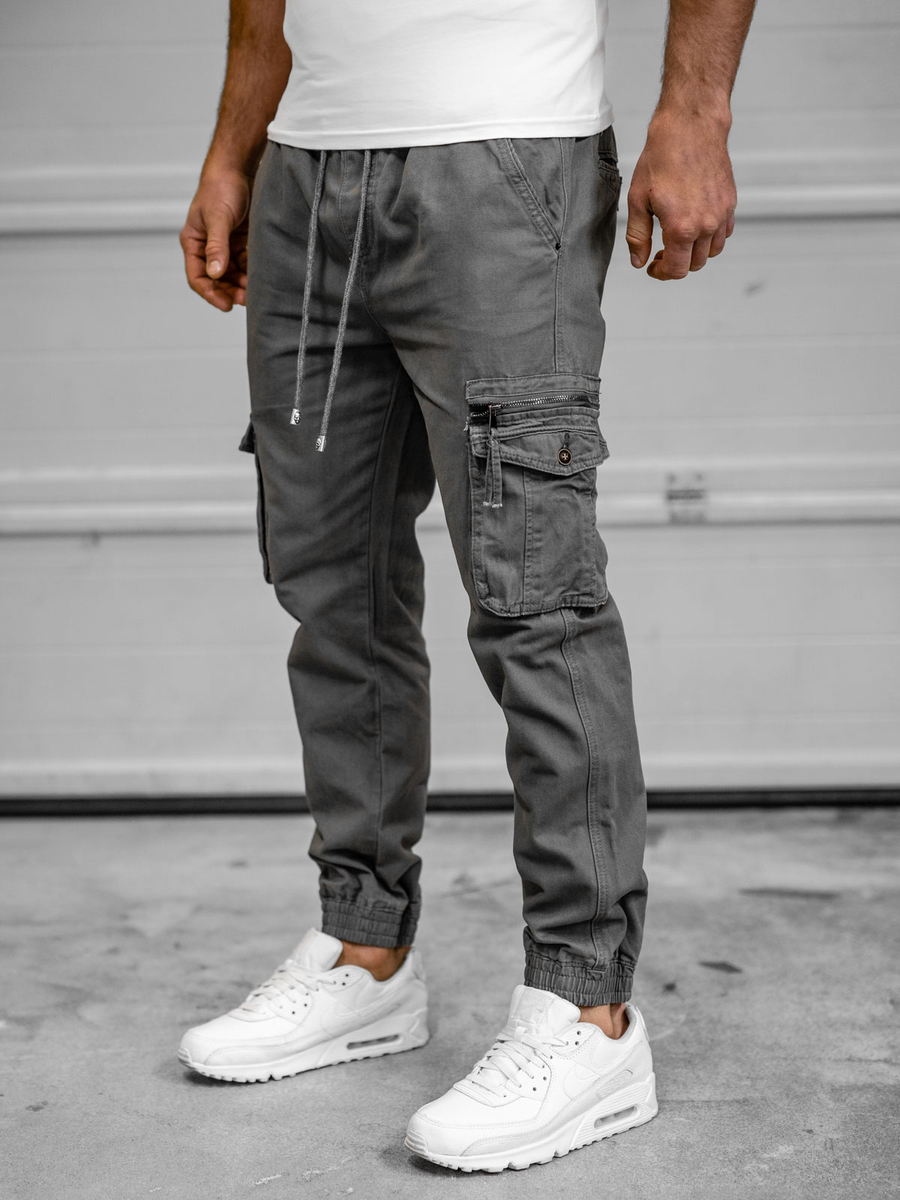 Pantalonii de jogging cargo din grafit Bolf MP0181GA sunt perfecti pentru a crea stiluri de zi cu zi. Datorită ajustării taliei cu un șnur și șnur puternic, se potrivesc perfect silueta.Au buzunare clasice din față, buzunare din spate prinse cu nasture și buzunare laterale acoperite cu clapă, prinse cu nasture. Elementul decorativ este o imitație la modă a unui buzunar prins cu fermoar. La picioare finisați cu elastic, datorită acestui lucru arată estetic dar și protejează de frig și vant. Sunt realizate din bumbac 100%. Datorită materialului de cea mai înaltă calitate, te vei simți confortabil în ele. Pantalonii de jogging vor arăta grozav cu un tricou și un hanorac.