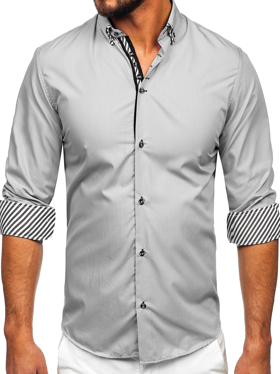 Cămăși slim fit gri cu mâneca lungă Bolf. Conferă stil și încredere, arată minunat în combinare cu blugi sau pantaloni bej. Cămașa gri are guler interesant și închidere decorativă O poți îmbrăca de asemenea sub sacou.