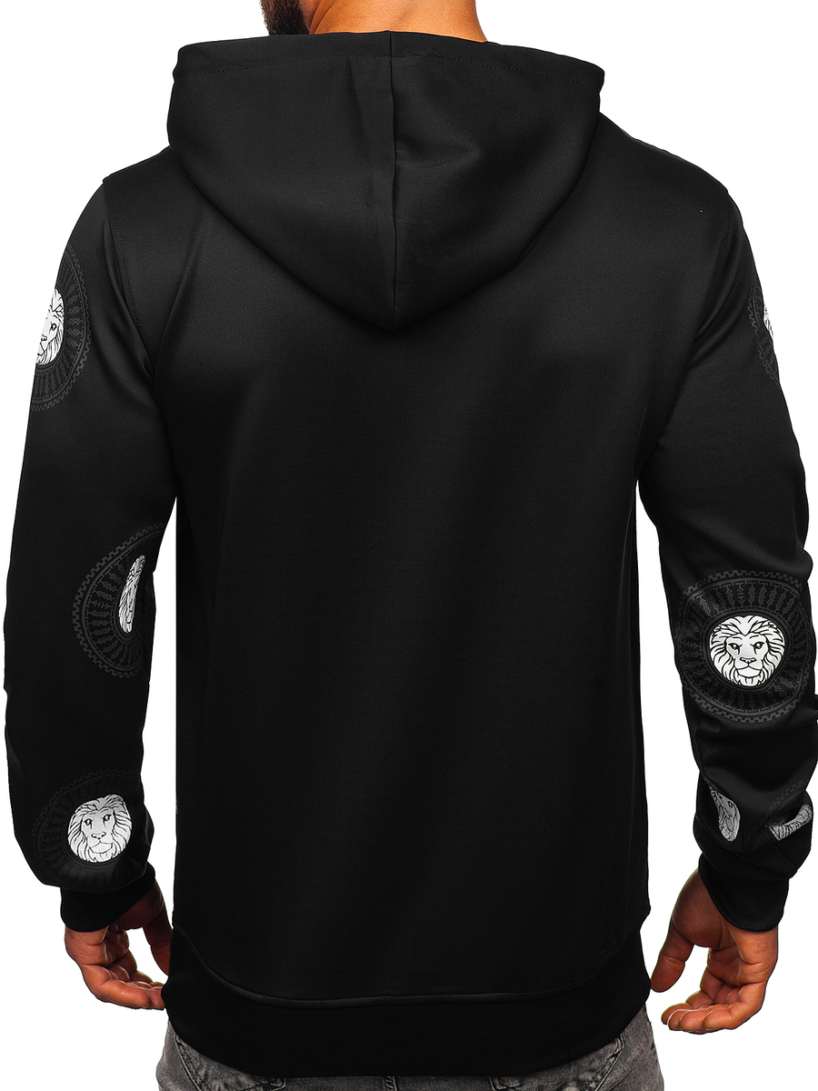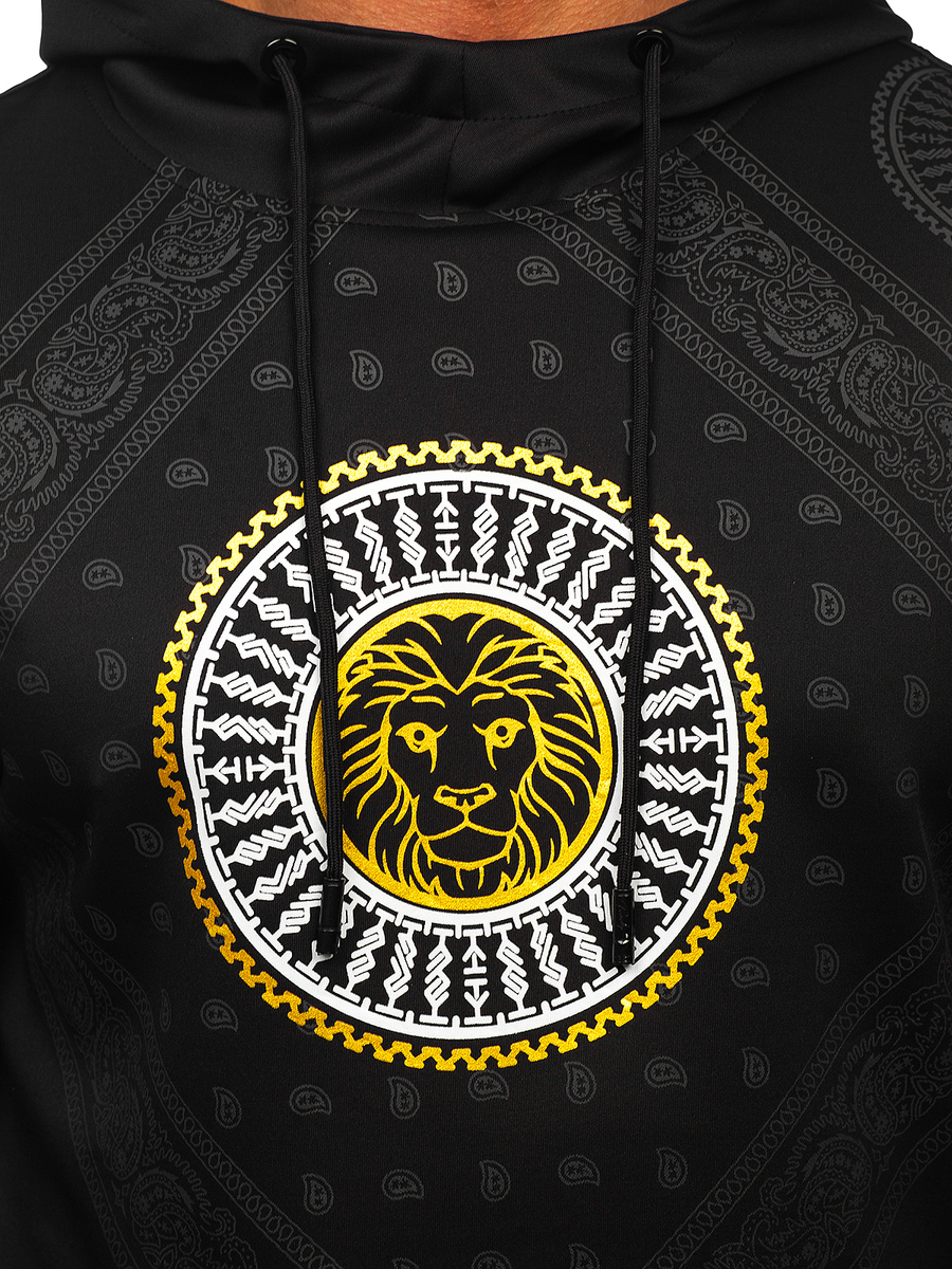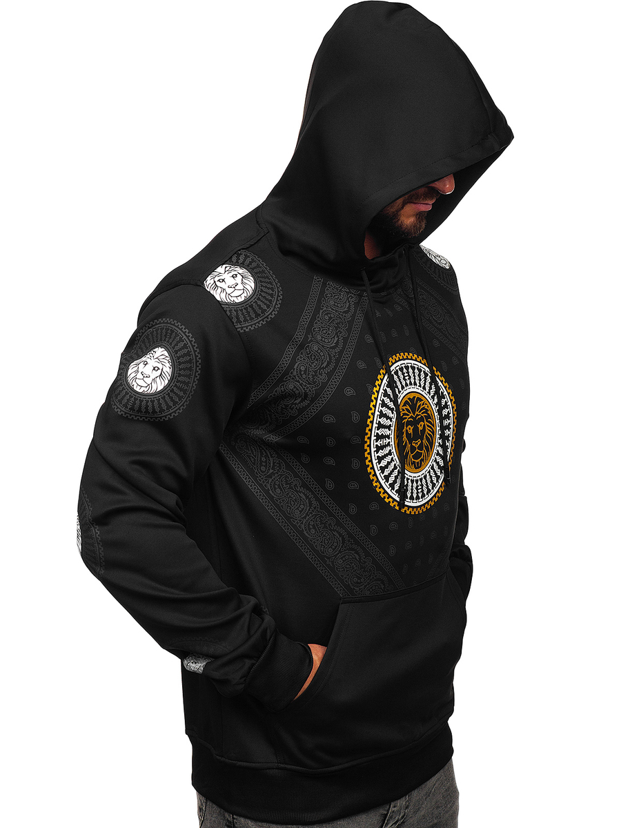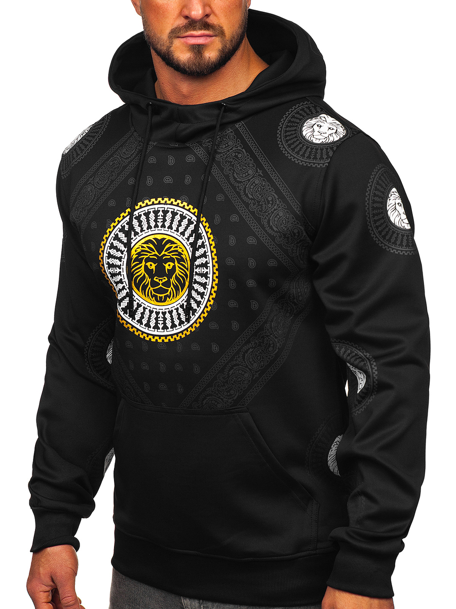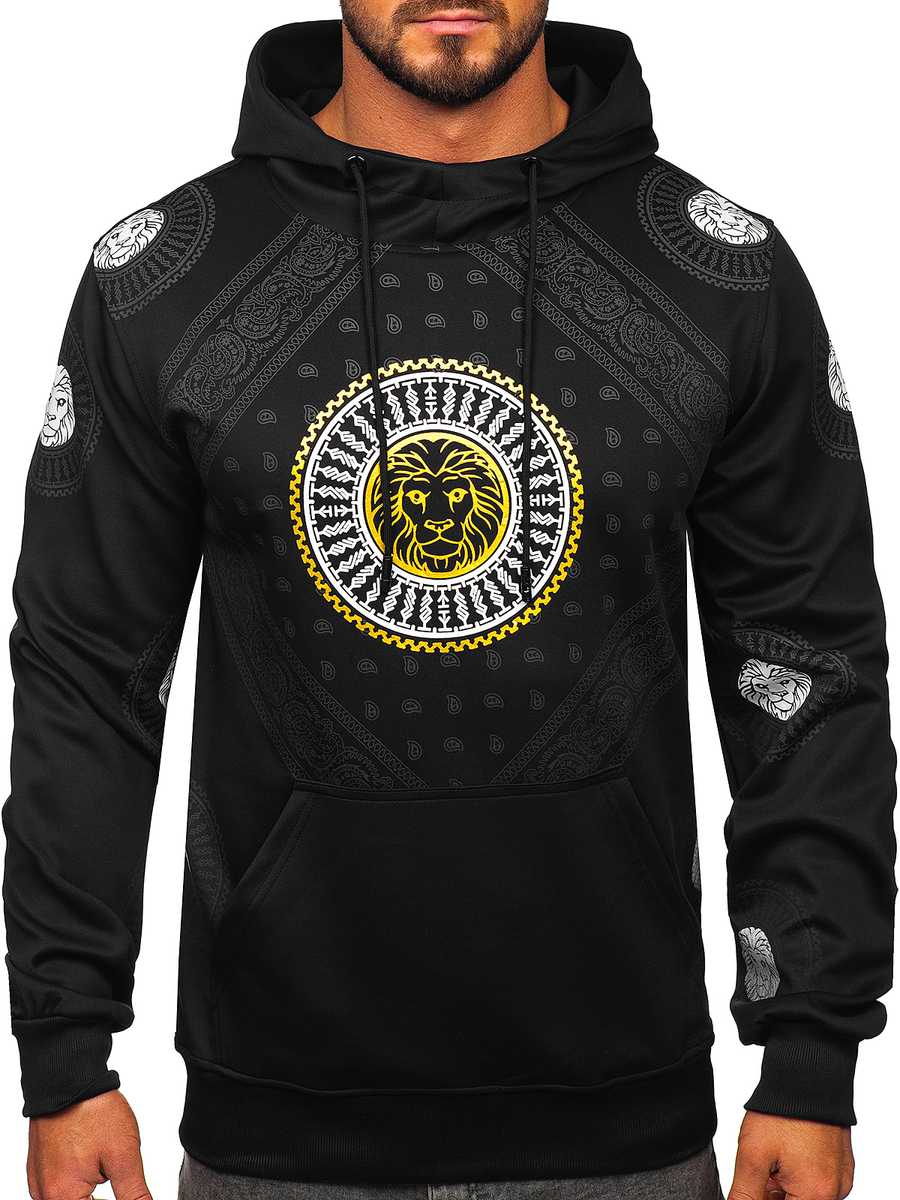 Bluza neagră Bolf 8B990 este un produs care se va potrivi excelent în zilele mai reci. Bluza se îmbracă peste cap și are glugă reglabilă cu șnur negru. Bluza te va proteja de frig și vânt. Suplimentar a fost confecționată din material moale și plăcut la atingere. Are buzunar mare tip cangur în partea frontală unde poți păstra telefonul sau alte lucruri Elementul distinctiv este modelul auriu și alb care înfățișează un leu, situat pe partea din față a hanoracului și pe mâneci. Bluza va arăta fantastic în combinare cu pantaloni joggers și geacă sport. Disponibilă în mărimi: M, L, XL și 2XL.