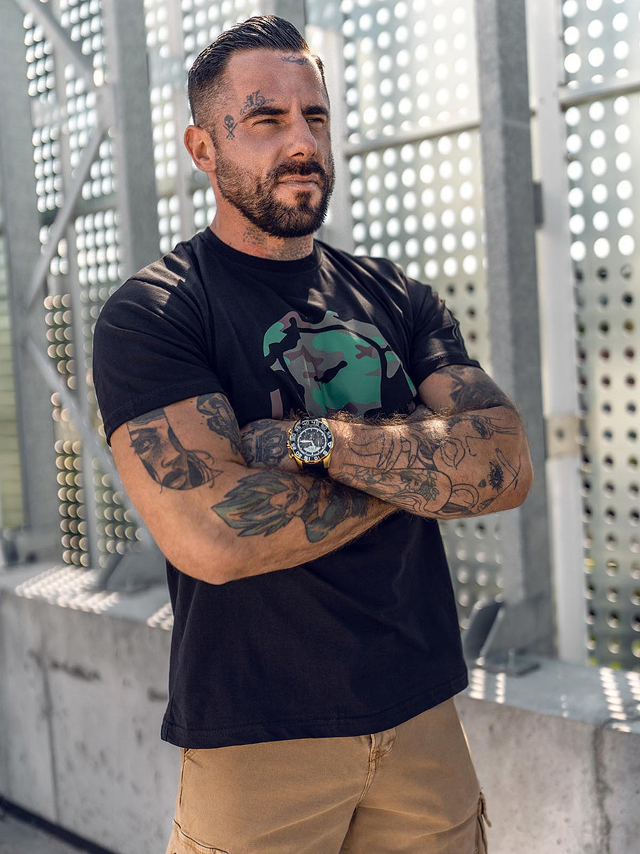 Tricoul bărbătesc negru cu imprimeu Bolf 192379A este alegerea perfectă pentru bărbații care apreciază moda și confortul la un loc. Fabricat din bumbac de înaltă calitate, este moale și plăcut la atingere. Decolteul rotund și croiul mulat îl fac să sublinieze perfect silueta, fără a restricționa mișcarea. Imprimeul din față adaugă caracter și individualitate. Indiferent dacă ieșiți cu prietenii, la muncă sau la cumpărături, acest model de tricou va funcționa perfect. Este ușor să-l combinați cu alte articole de garderobă. Se potrivește atât blugi, cât și joggeri și pantaloni scurți.