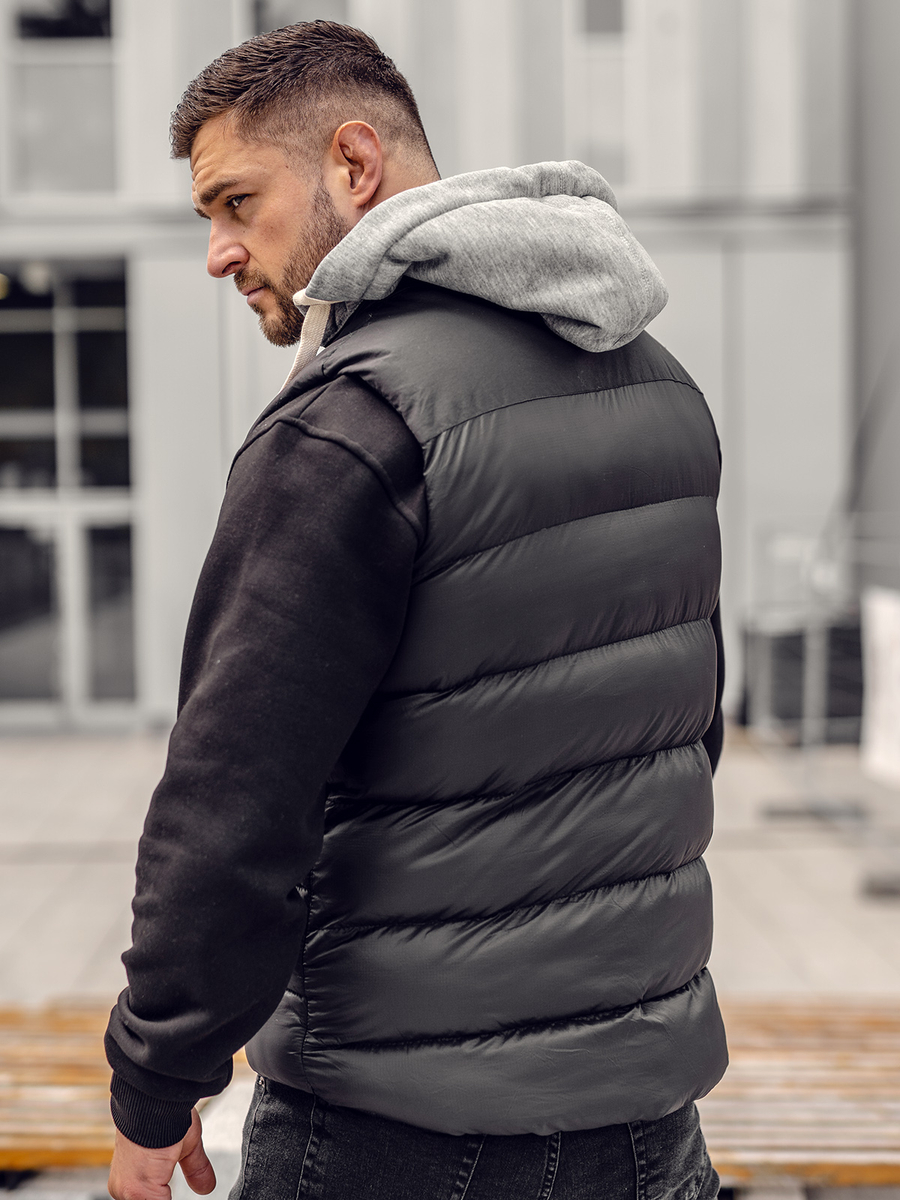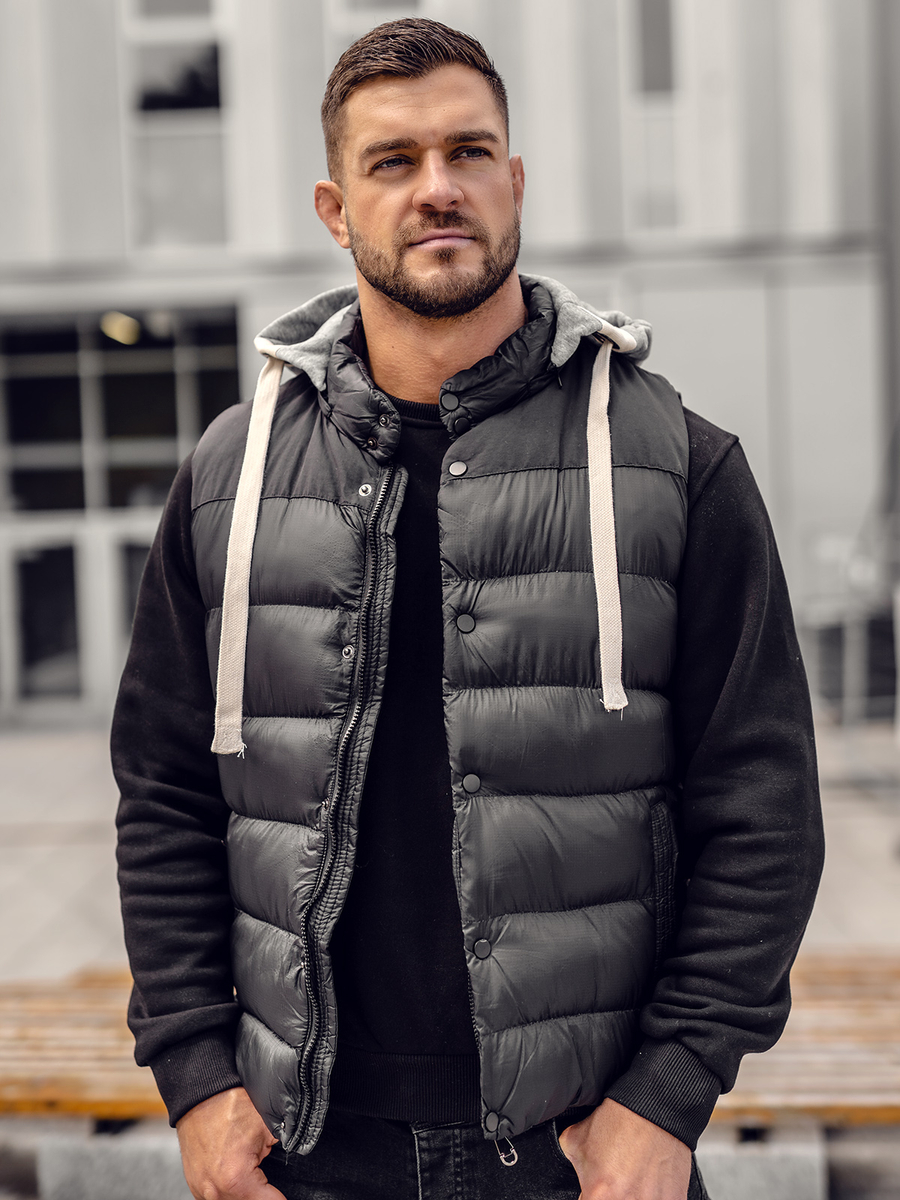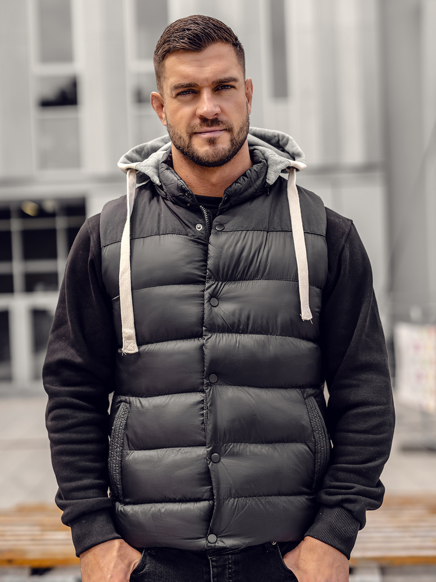 Vestă neagră cu glugă Bolf 13078A se va potrivi excelent in ținutele de primăvara. Vesta are închidere cu fermoar și nasturi. Are gluga detasabila, reglabila si guler ridicat - datorita unor astfel de elemente, este un produs foarte practic. Are de asemenea, două buzunare externe cu fermoar și un buzunar intern unde poți ascunde în siguranță cele mai necesare lucruri, precum telefon, portofel sau documente Vesta a fost confecționată în mai multe culori. Este o vestă clasică cu un design sportiv, simplu. Va fi perfect pentru bărbații cărora le plac activitățile sportive. Vesta o poti folosi in fiecare zi in timpul unei excursii in oras, o intalnire cu prietenii sau o plimbare de seara. În combinare cu bluzăsau joggersvei obține o ținută excelentă. Se va combina excelent în combinare cubluză și blugi.