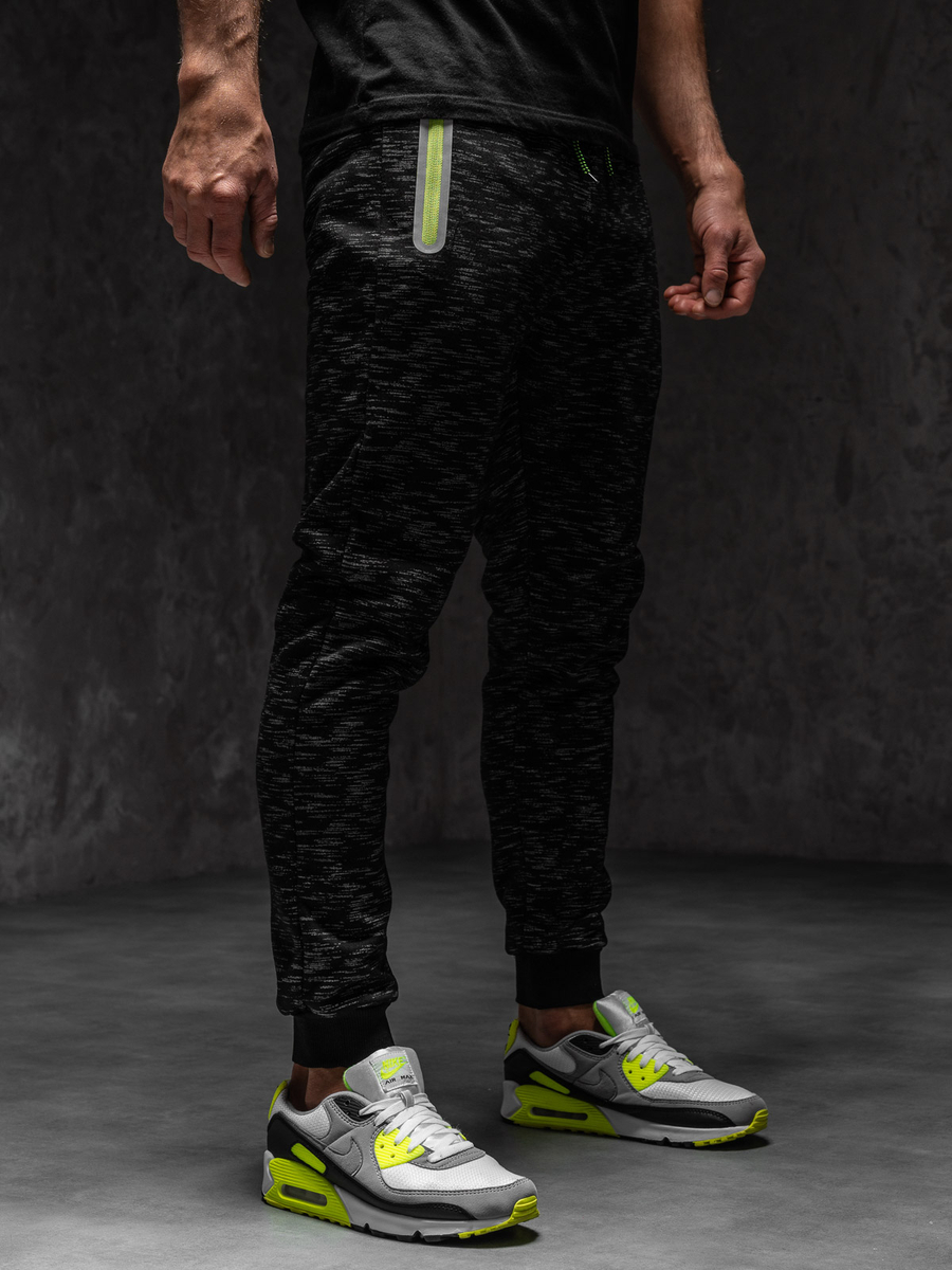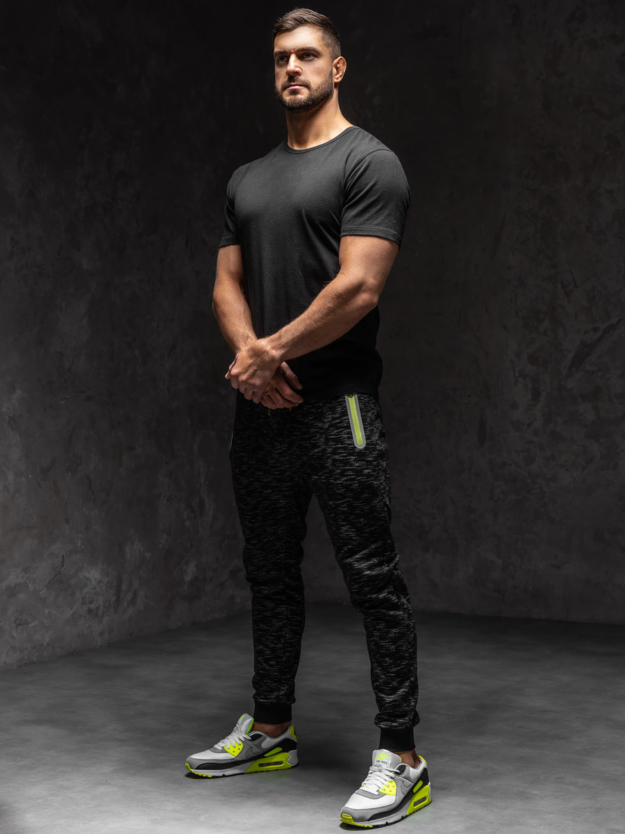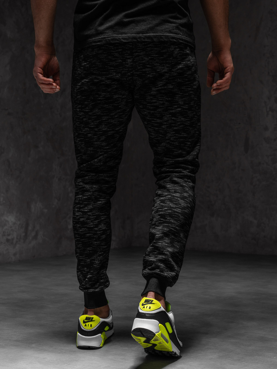 Pantaloni sport negri Bolf imprimați în model neregulat. Se așează excelent, au 2 buzunare cu închidere la fermoar și elastic practic în talie, inserții contrastante la buzunare. Folosește pantalonii negri în diverse ținute. Poartă-i cu t-shirt sau cu bluză.