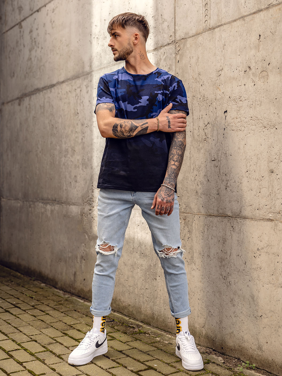 Tricoul pentru bărbați bleumarin cu imprimeu de camuflaj, Bolf S808A1, este destinat bărbaților care prețuiesc curajul și originalitatea în stilul lor. Tricoul are un model camo la modă și un decolteu rotund practic. Tricoul este decorat cu un motiv ombre. Este format din 65% bumbac și 35% poliester, ceea ce face tricoul elastic și se potrivește perfect siluetei. Mânecile și fundul sunt tăiate cu fir care se potrivește perfect cu culorile tricoului.
